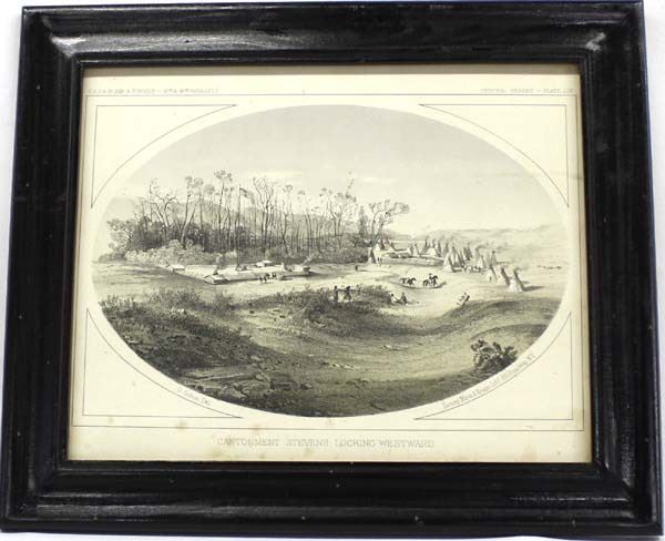 Pacific Railroad Survey (USPRR) Lithograph ''Cantonment Stevens, Looking West'', visual measures 7.5'' x 9.5'', top of the print reads ''USPRR EXP & SURVEYS - 47th & 49th PARALLELS'' and on the opposite side reads ''GENERAL REPORT PLATE LIX'', at the bottom of the picture reads ''G. Sohon Del.'' and ''Sarcony, Major, & Knapp Lithographers 449 Broadway St.'', bottom reads ''Catonment Stevens, Looking Westward'', date issued 1855-1860, Gustave Sohon (1825-1903), from Volume XII, this view was drawn by John Mix Stanley from a sketch by R. H. Kern