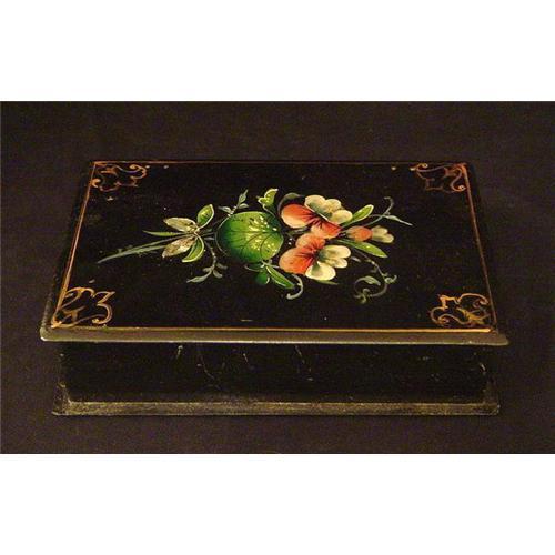 Black with hand-painted flowers and mother-of-pearl leaves. New hinges. In very good condition. For the serious collector.