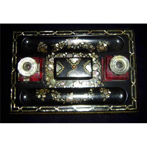 Mother-of-Pearl and lacquer create the dramatic combination. Has two ink wells, 2.75 inches high x 2" wide x 2" deep. A center lacquer and mother-of-pearl box measures 3" wide, 1.75" deep, 1.25 inches high. Has recesses for pens. All original design. In excellent condition.
