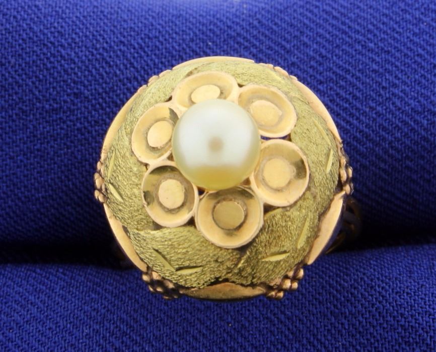The pearl measures 6.5mm and a pinkish cream tone. The ring is 14k green and rose color gold. The ring is 3/4 inch in diameter and condition is excellent for a ring of this age. Tested scratch and electronic to 14k. 5.2g