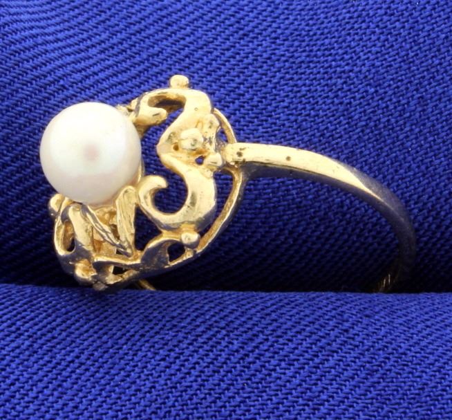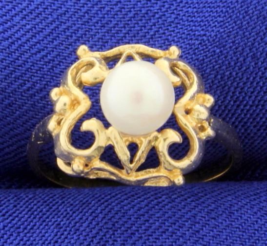In 10K yellow gold, there is a 5.9mm pearl with excellent color. Size 6 1/2 2.1g
