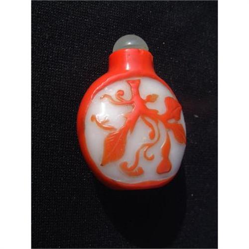 Antique Peking glass snuff bottle with carved carmine-red outlay on opaque glass background. It is decorated with gourds and vines carved in relief. Length: 2.4" (6 cm.).