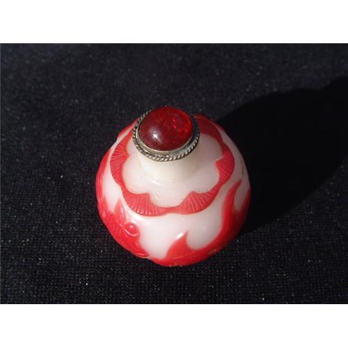 Antique Peking glass snuff bottle with carved red outlay on milky, opaque glass background. It is decorated with goldfish design carved in relief. Length: 2" (5 cm.).