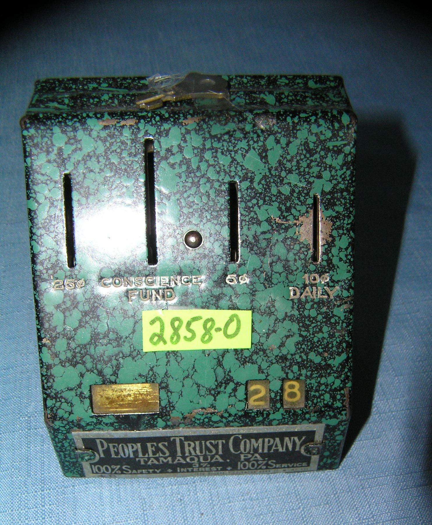Antique tin and pressed steel People's Trust Co. coin saving bank est. value $100.00-$125.00