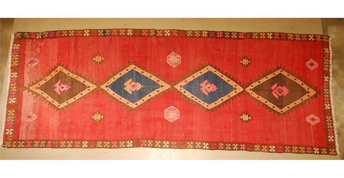 Hand made Antique Persian Kilim 5' x 12', discoloration and repairs due to its age.