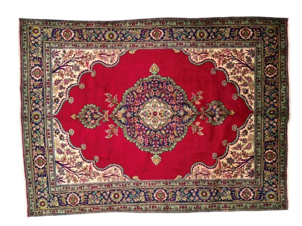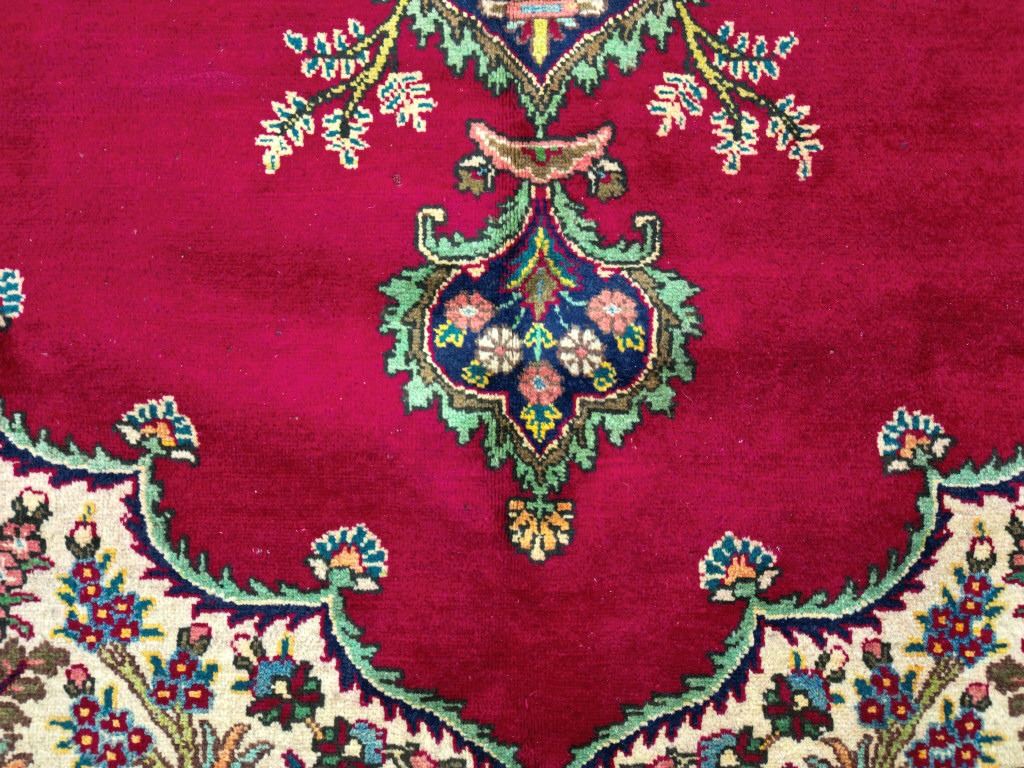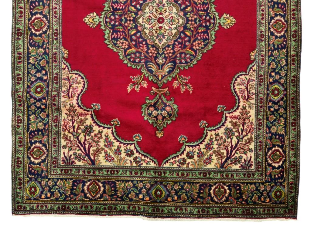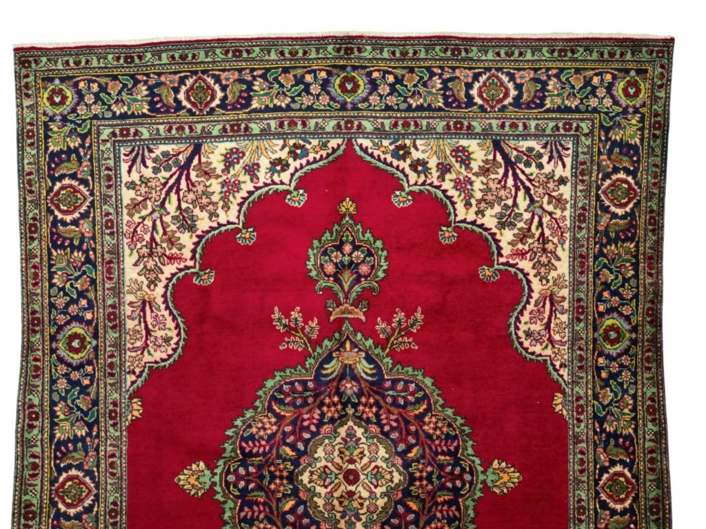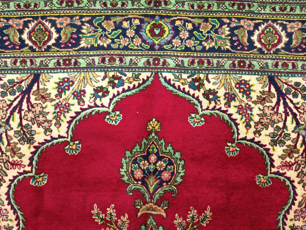 For your consideration is an Antique Persian Tabriz Hand-Knotted Rug, circa 1920s. Presented in this lot is an Antique Persian Serapi Hand-knotted Wool Runner Rug. The rug features a fine detailed design, bright colours, and a tight weave, circa early 20th century. The Heriz rug is one of the most well-known styles of Persian rugs, known for its unique styles and patterns. Serapis, for example, have been considered the finest grade of Heriz since the beginning of the 20th century. Their name is connected to the Serab village, where they originally came from. This category of Persian carpets has the finest handmade vintage and antique rugs. Rug enthusiasts worldwide still purchase these ancient antique Serapi carpets because they still ooze grandeur and an aura of complete magnificence. The rugs are produced in the city of Heriz, which is located in northwestern Iran near the city of Tabriz. Traces of copper in the drinking water of sheep produces high quality wool that is far more resilient than wool from other areas. The Heriz Carpet is the only carpet in the world where stories of the Old times are woven. The popularity of a Serapi carpet may be attributed to several beautiful qualities of the rug, but most significantly to its alluring hues and color schemes. The rug displays wonderfully and professionally handcrafted wool construction and shows geometric floral patterns along the borders, with the centre of the rug showing a large centre geometric medallion against a rich red background, which sits with predominately cream white colour floral corners. Rug colours include red, rose, forest green, yellow and greyish blue throughout the piece, cream coloured fringe on each end. The rug shows very nice condition overall, with little to no wear. Measures 84"W x 113"L S504