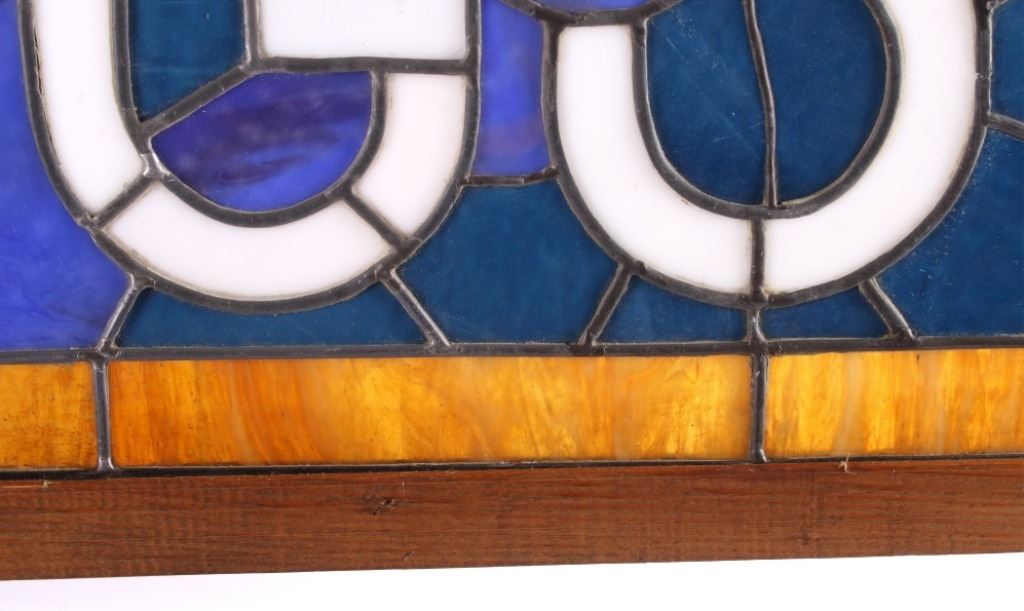 This is an antique pharmacy stained glass sign from the early 1900's. The sign has a wooden frame and reads "Drugs". The piece shows good overall condition with two panels showing a crack but no missing glass. The sign measures 18 ½” x 54 ½”.