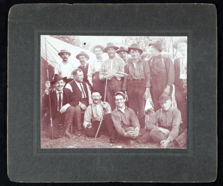 Here is an antique photo on a backing measuring 7x 6 inches. It is a group portrait of men outside by a tent, on a hunting and fishing expedition. These look like rugged guys, and one has a rifle and pipe, and another a fishing rod. The details are crisp