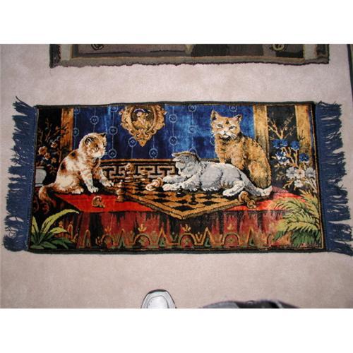Early Pictorial Cat Rug. Beautiful scene of cats playing together atop a chess board. Colors are very vibrant! This rug is 20in x 38 in., with 4 inches of blue fringe on each end. Fringe is in original condition as is rug. This may be considered a sleigh rug, but I am not sure. Great collectors'item.