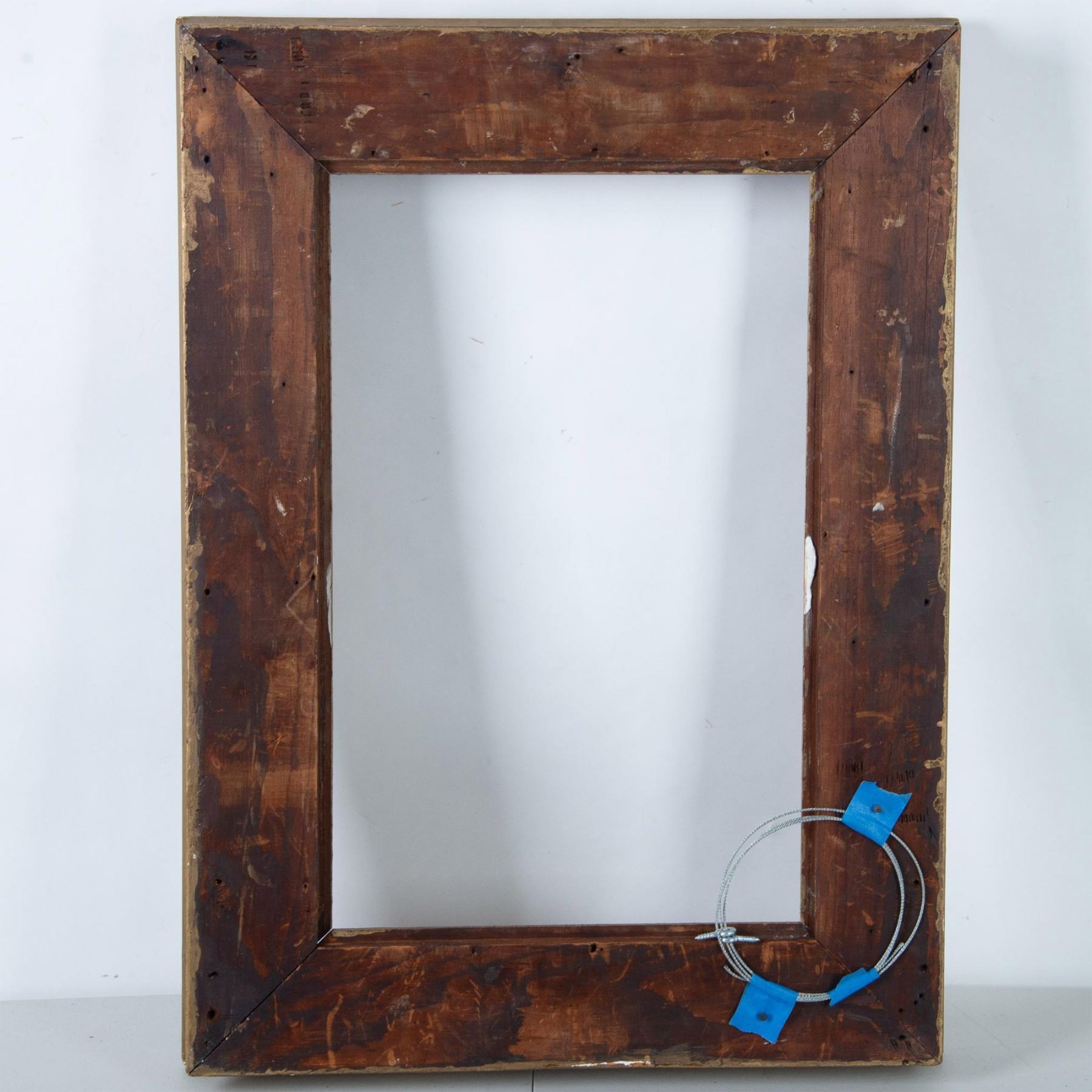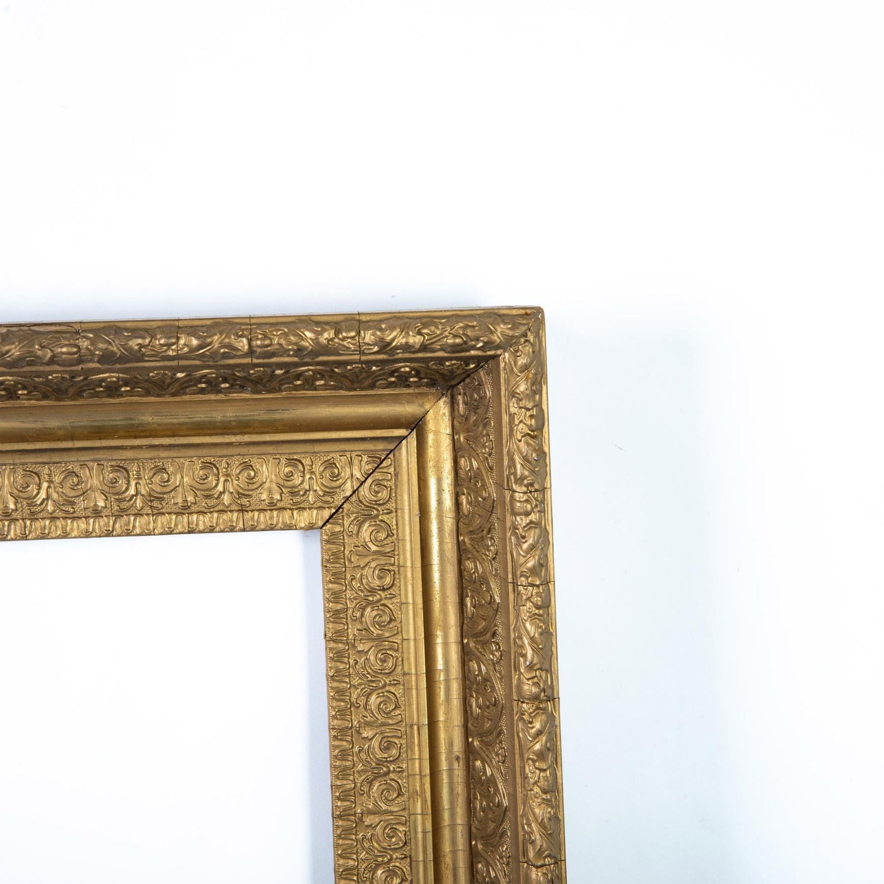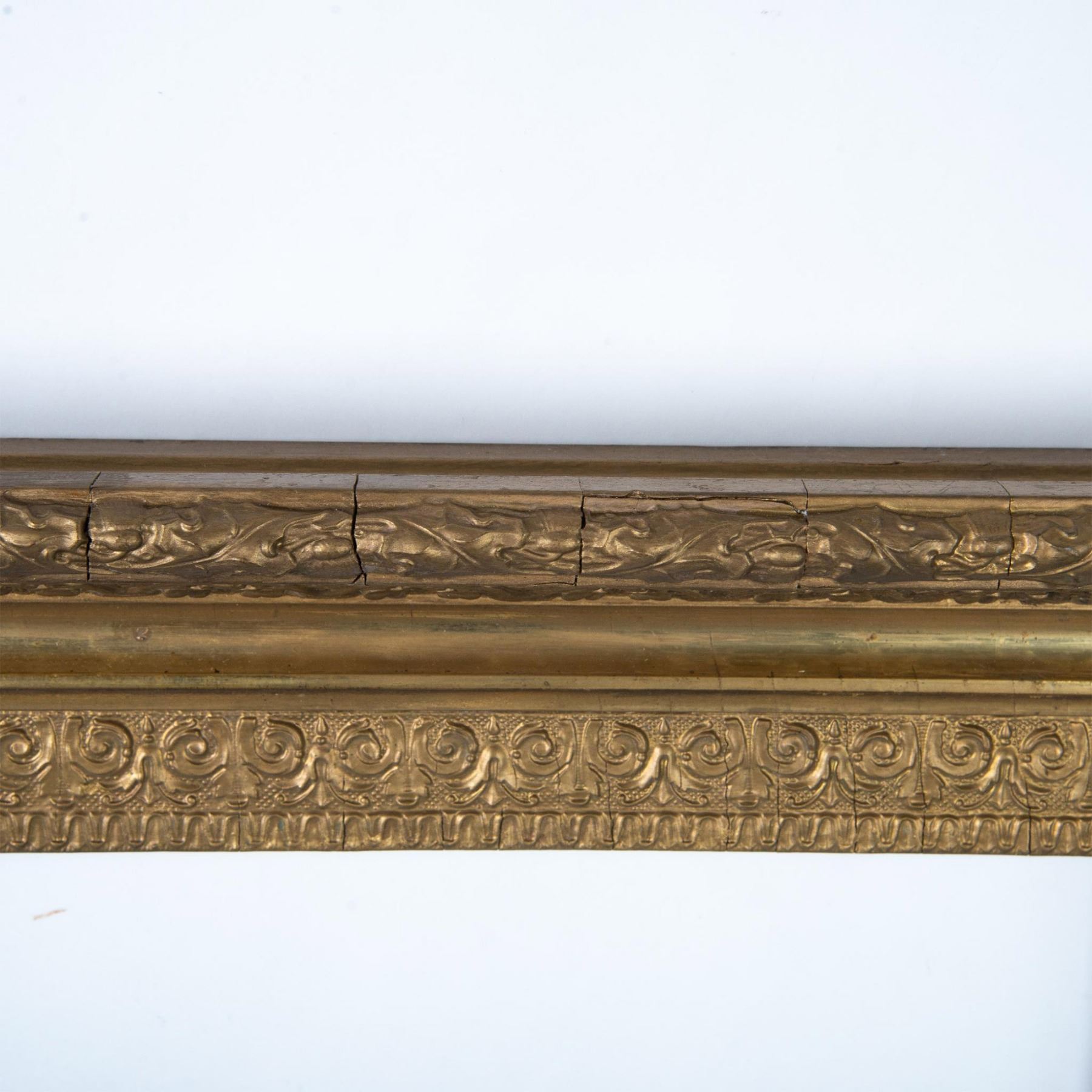 This beautiful antique picture frame is made of solid wood and is covered with gilded plaster that follows an intricate trefoil design, rosettes, and foliage patterns. Frame dimensions: 23"L x 3.25"W x 31"H.