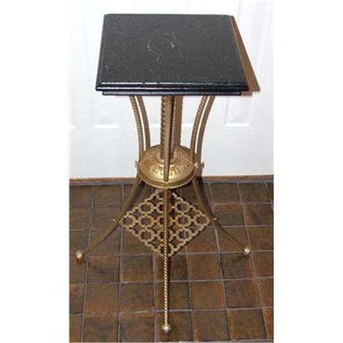 Antique plant stand with gilded rope twist metal legs. This very handsome plant stand has a square black-painted wooden top with age crackling. The gilded metal alloy base features four curved rope twist legs, a round decorative central support, and a chain link lower shelf. This distinctive piece measures approximately 29.25 inches high and 16 inches square, and weighs 14 pounds, which is substantial given its slender silhouette. The solid wooden table top measures approximately 12 inches square and 1.5 inches thick, and features nicely moulded edges. The gilded base measures approximately 16 inches square at the floor. This piece is in very good condition, very solid and sturdy, with the table top showing crazing of the finish due to age. The gilded base has some minor scuffing near the bottom. Please refer to the 4 photographs for appearance and condition. Shipping / packaging / handling will be $25 - $55 depending upon location and zipcode of the buyer.