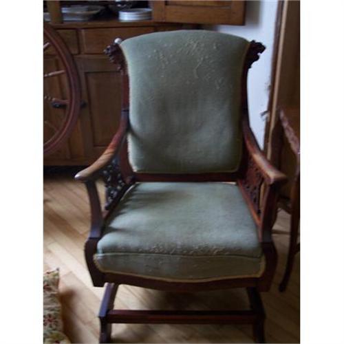 Another piece that I have had for many years.I am re-decorating so am selling some pieces that I can no longer use.This is a nice heavy platform rocker with what looks like Lions heads on each side at the top.It could be re-covered,as this is how it was when I purchased it years ago.I always assumed they either had a cat or there was perhaps a tapestry attached to it.Either way there are pulled threads that could probably be clipped and left as is.I do not know alot about furniture.Only bought what I liked at the time .Very sturdy rocker.Item can be shipped at buyers expense.