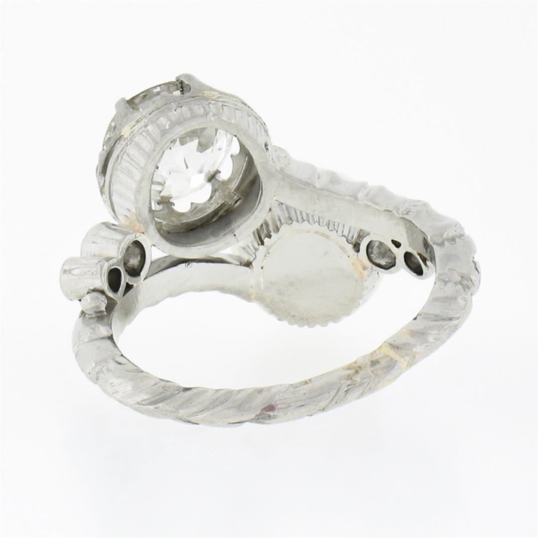 An antique solid platinum bypass ring, with 1 Gia certified old European cut natural diamond (J - I1 ; 1.36c), and 1 round shape cultured pearl (8.20mm), accented with 4 old single cut natural diamonds (G/H - VS1/VS2 ; 0.14ctw). The ring is size 5.0, weighs a total of 6.80 grams, and measures 15.30mm wide. Comes with all original relevant certifications.