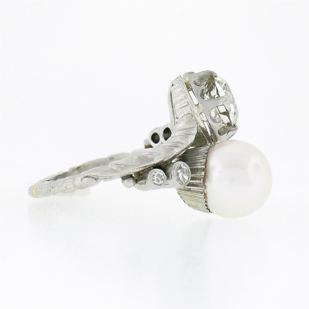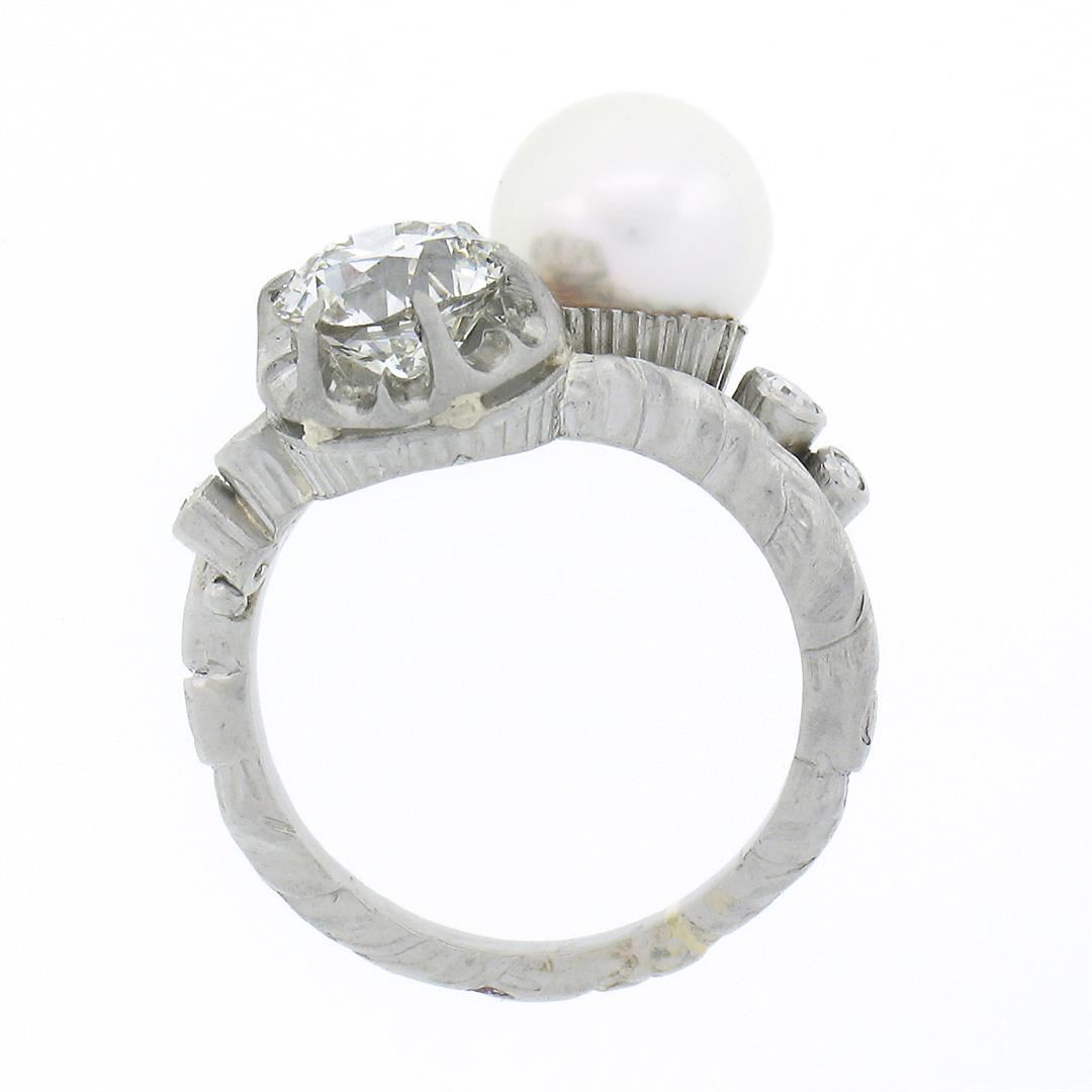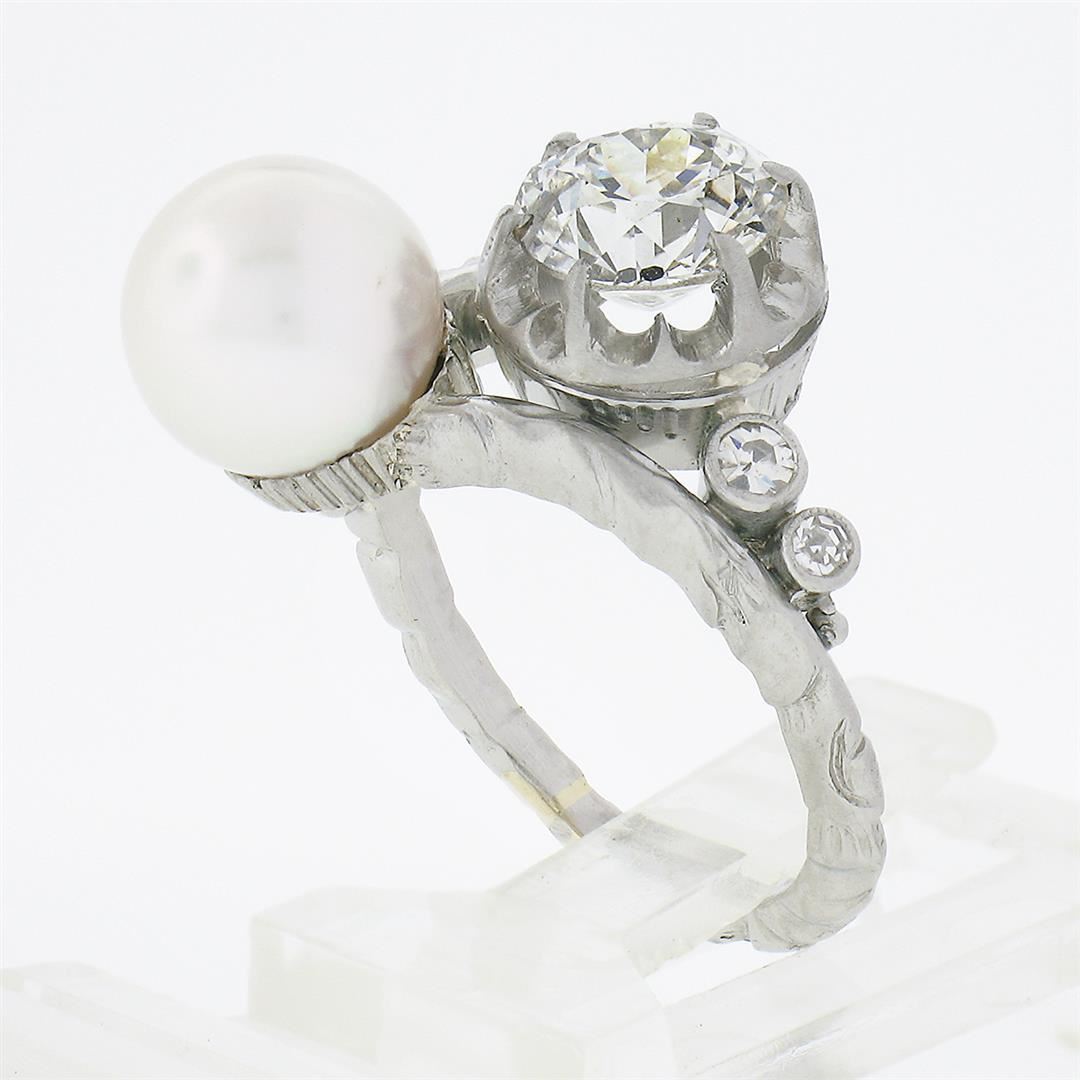 An antique solid platinum bypass ring, with 1 Gia certified old European cut natural diamond (J - I1 ; 1.36c), and 1 round shape cultured pearl (8.20mm), accented with 4 old single cut natural diamonds (G/H - VS1/VS2 ; 0.14ctw). The ring is size 5.0, weighs a total of 6.80 grams, and measures 15.30mm wide. Comes with all original relevant certifications.