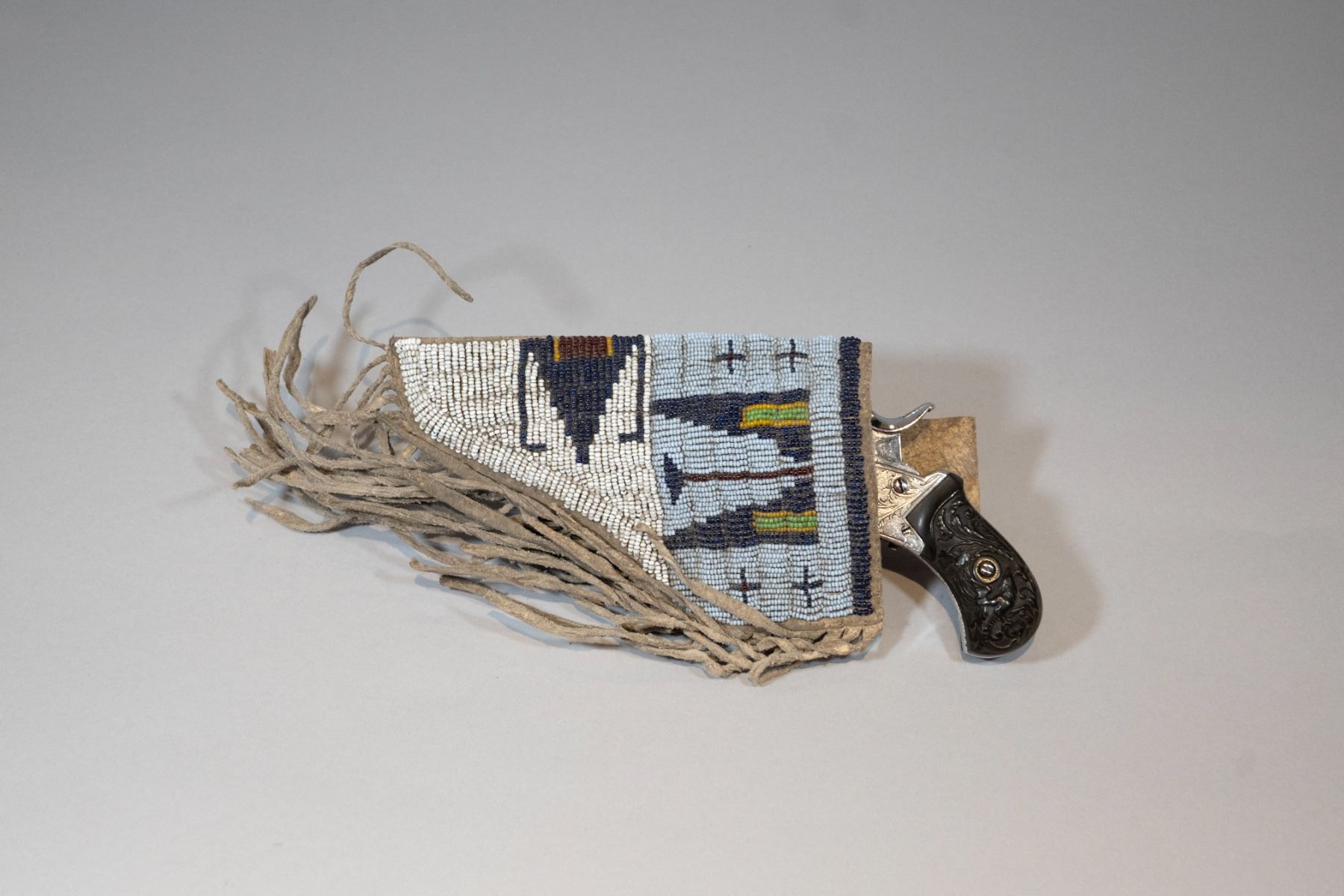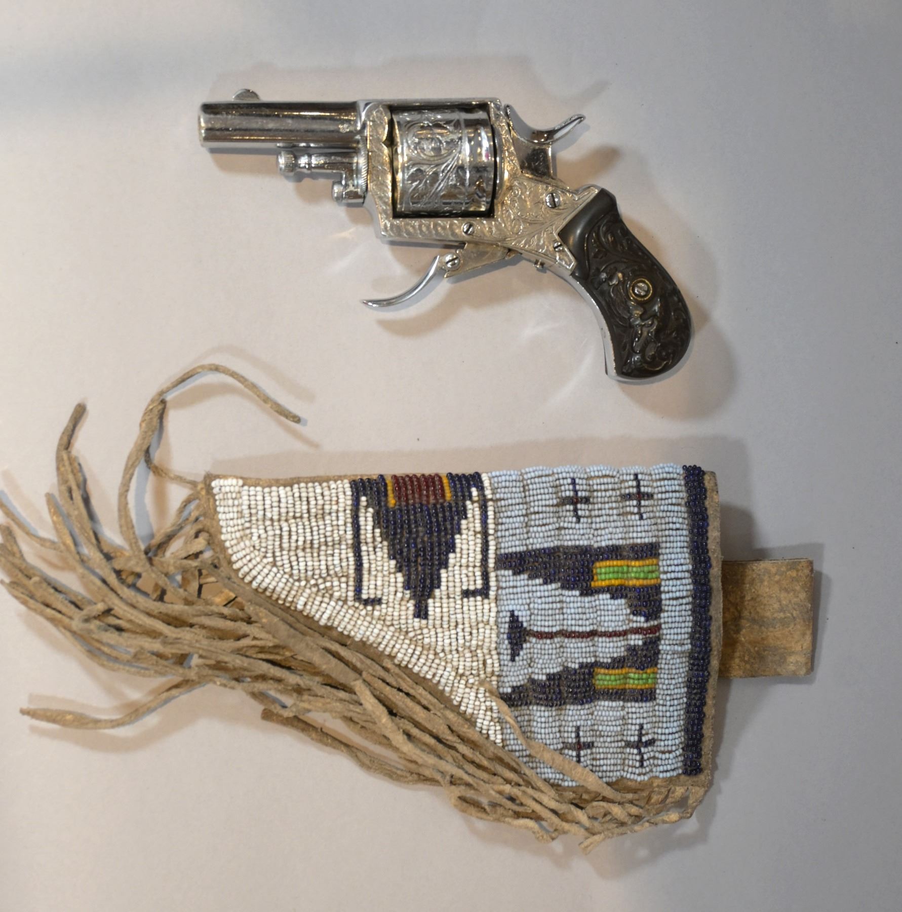 Continental, 19th century, single shot round, 2 1/4", steel barrel with Belgian proof marks, finely engraved scrolling leaf decoration throughout, swivel ramrod, six chamber cylinder, folding trigger and carved ebony grip. Accompanied with a Native American beaded holster with geometric design on hide with fringe.