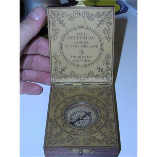 <P>This item is all in French. Inside papers read as follows: "Seul selection assure votre message 5 heueres de lecture". Roughly translated this means "alone selection assures has your 5 hours of reading". Somehow the text relates to how the sundial works.