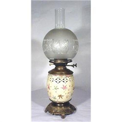 Here is an absolutely wonderful and quite rare oil burning lamp. It is very unique in the fact that the lamp is actually Chinese export porcelain. It has really nice enameling and pierce work along the top. There is a signature of the maker on the exterior of the lamp and I hope you can see it in the photographs. It is on a brass or iron patinated base which is rather ornate. Inside the lamp base on the porcelain there is an attached paper label which reads ? Manufactured by R Hollings & Co 547 Washington St. Boston. There is a brass font with a double burner. On the wick risers of the double duplex burner it reads ? Whight & Butler Improved Duplex Burner Birmingham and on the second riser most of the same words with the word Patent. The burner is in fine working condition. It is complete with a chimney and as you can see an absolutely spectacular ball shade in clear and frosted glass in almost in a slightly complimenting oriental flare pattern that matches the little floral designs on the earthenware. So here you have a rear and wonderful lamp - I would suspect it would be a long time before someone saw a similar example. This lamp is still in its original oil burning state. The lamp is 21? at highest (top of chimney) x 6? at widest and at deepest.