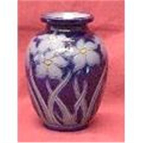 This is A very beautiful pottery in Navy Blue color background and Lilies in Gray and yellow color and in excellent condition. H:4.3/4" _ Widest:3.1/2"