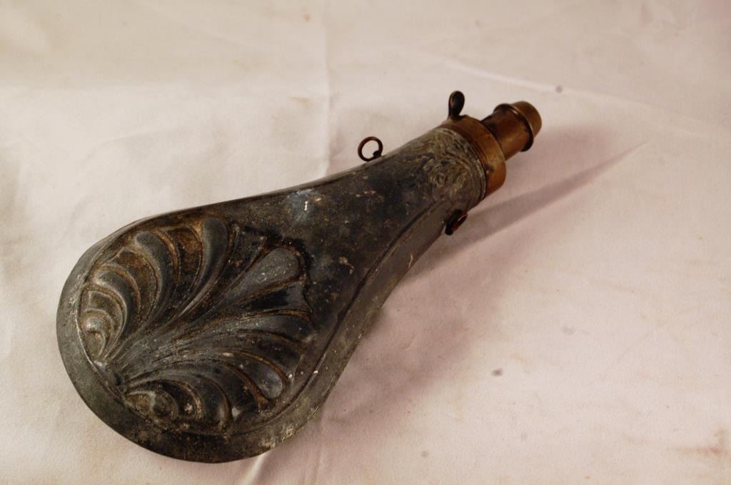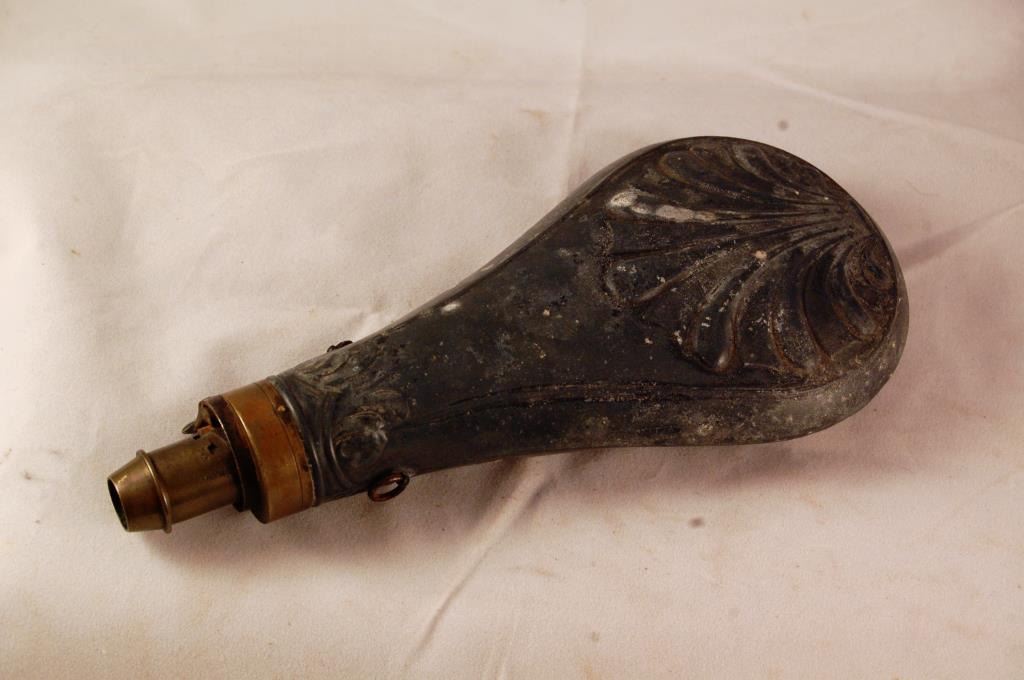 Antique powder flask with a brass riffle-size charger, adjustable from 3.5 to 2.5 drams. Zinc body with shell design. Good seams. 8.25