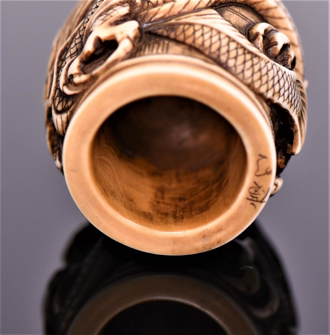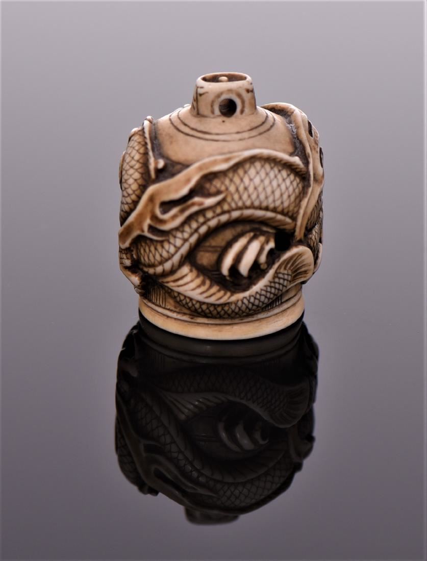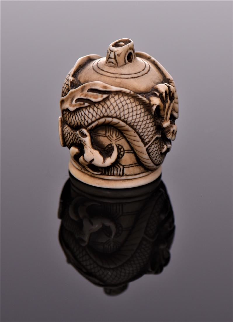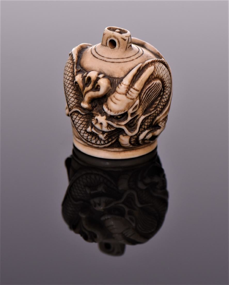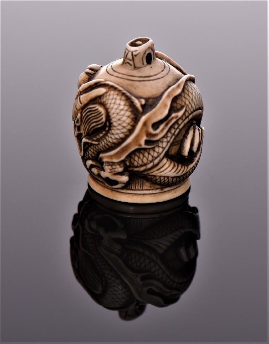 Antique Pre-Ban Japanese Flying Dragon Signed Netsuke. NOTE: Please be aware of US laws when bidding. This item cannot be shipped to certain US states and outside the United States. As a condition of the sale, all buyers agree to comply with all Federal regulations on ivory and the rules of the U.S. Fish & Wildlife Service â??CITESâ? as it relates to transport. It is the purchaserâ??s sole responsibility to obtain any and all licenses and/or certificates, as well as any other requirements. Estimated more than 100 yrs old. Japanese art covers a wide range of art styles and media, including ancient pottery, sculpture, ink painting and calligraphy on silk and paper, ukiyo-e paintings and woodblock prints, kiri-e, kirigami, origami, along with a myriad of other types of works of art. The earliest complex art in Japan was produced in the 7th and 8th centuries in connection with Buddhism. In the 9th century, as the Japanese began to turn away from China and develop indigenous forms of expression, the secular arts became increasingly important; until the late 15th century, both religious and secular arts flourished. Painting is the preferred artistic expression in Japan. Until modern times, the Japanese wrote with a brush rather than a pen, and their familiarity with brush techniques has made them particularly sensitive to the values and aesthetics of painting. With the rise of popular culture in the Edo period, a style of woodblock prints became a major form and its techniques were fine tuned to produce colorful prints. The Japanese, in this period, found sculpture a much less sympathetic medium for artistic expression. Japanese ceramics are among the finest in the world and include the earliest known artifacts of their culture. In architecture, Japanese preferences for natural materials and an interaction of interior and exterior space are clearly expressed. (Wikipedia) Size and/or Weight: See Measurement Photo. (Photos Represent The Lot Condition.)