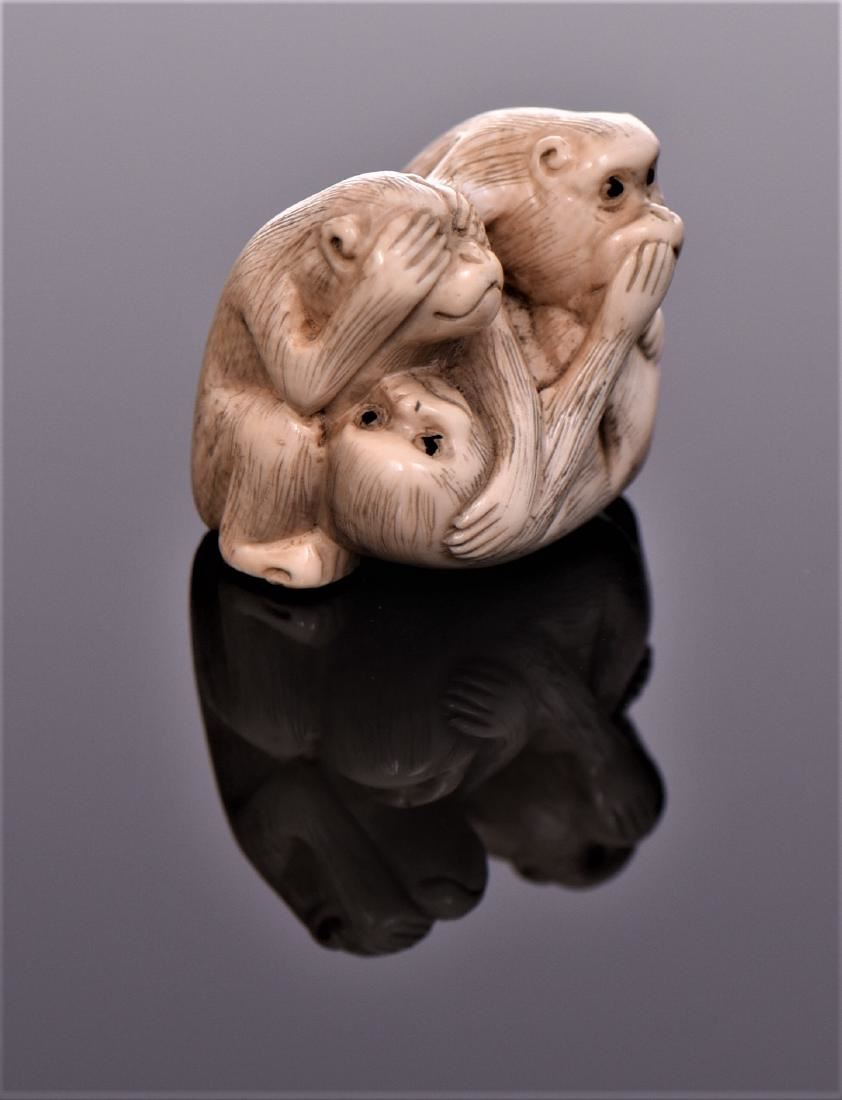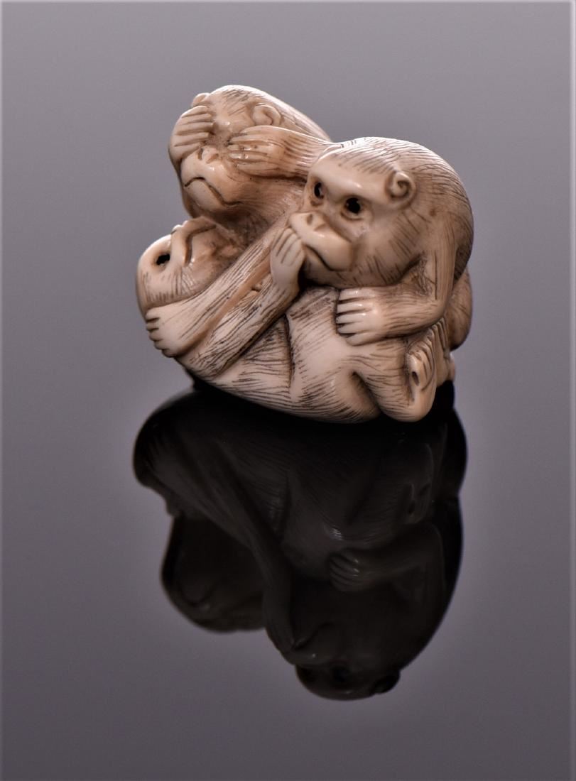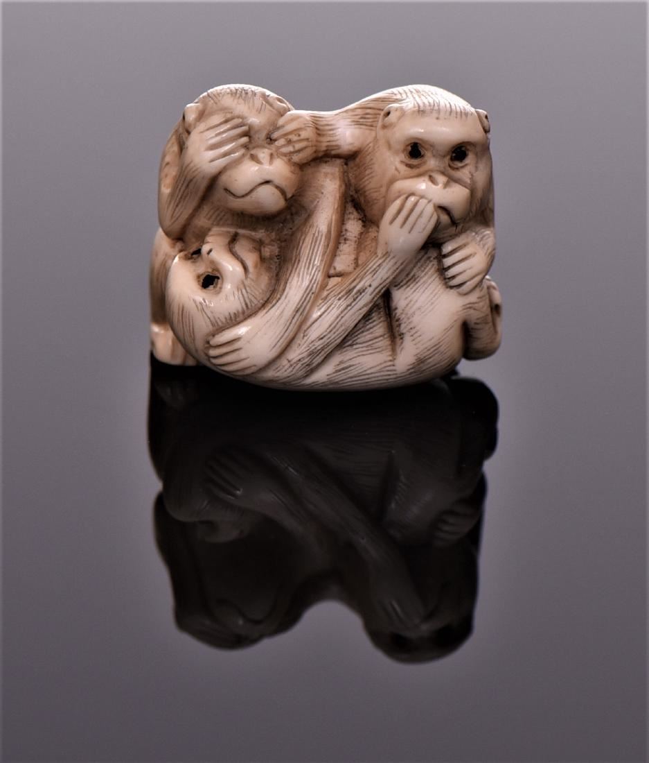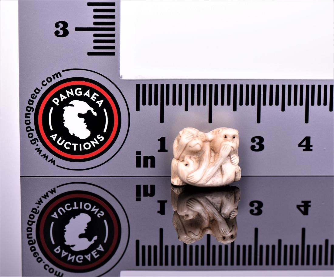 Antique Pre-Ban Japanese Netsuke Depicting Three Monkeys, See No Evil, Speak No Evil, Hear No Evil. NOTE: Please be aware of US laws when bidding. This item cannot be shipped to certain US states and outside the United States. As a condition of the sale, all buyers agree to comply with all Federal regulations on ivory and the rules of the U.S. Fish & Wildlife Service â??CITESâ? as it relates to transport. It is the purchaserâ??s sole responsibility to obtain any and all licenses and/or certificates, as well as any other requirements. Estimated more than 100 yrs old. Japanese art covers a wide range of art styles and media, including ancient pottery, sculpture, ink painting and calligraphy on silk and paper, ukiyo-e paintings and woodblock prints, kiri-e, kirigami, origami, along with a myriad of other types of works of art. The earliest complex art in Japan was produced in the 7th and 8th centuries in connection with Buddhism. In the 9th century, as the Japanese began to turn away from China and develop indigenous forms of expression, the secular arts became increasingly important; until the late 15th century, both religious and secular arts flourished. Painting is the preferred artistic expression in Japan. Until modern times, the Japanese wrote with a brush rather than a pen, and their familiarity with brush techniques has made them particularly sensitive to the values and aesthetics of painting. With the rise of popular culture in the Edo period, a style of woodblock prints became a major form and its techniques were fine tuned to produce colorful prints. The Japanese, in this period, found sculpture a much less sympathetic medium for artistic expression. Japanese ceramics are among the finest in the world and include the earliest known artifacts of their culture. In architecture, Japanese preferences for natural materials and an interaction of interior and exterior space are clearly expressed. (Wikipedia) Size and/or Weight: See Measurement Photo. (Photos Represent The Lot Condition.)