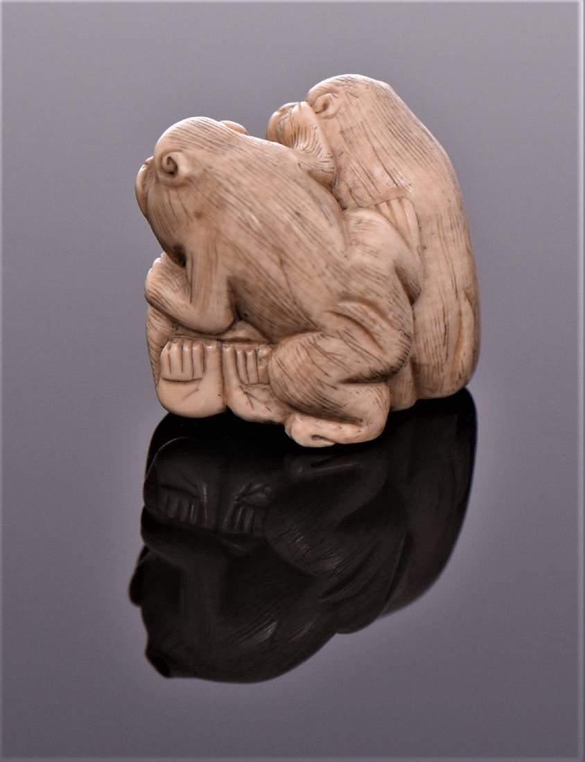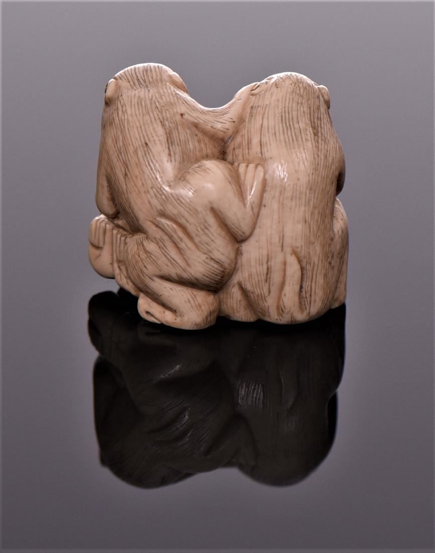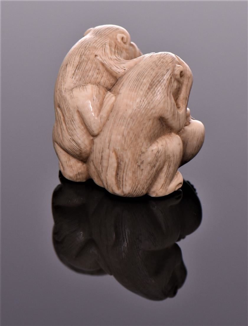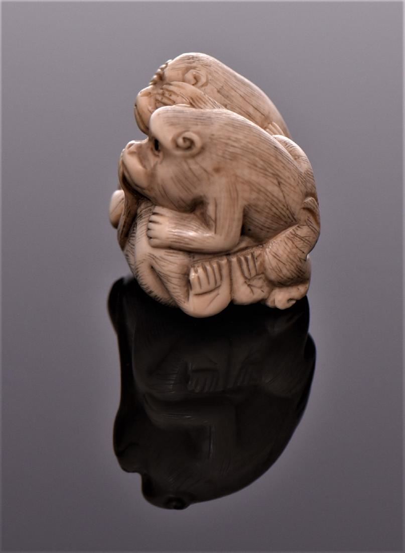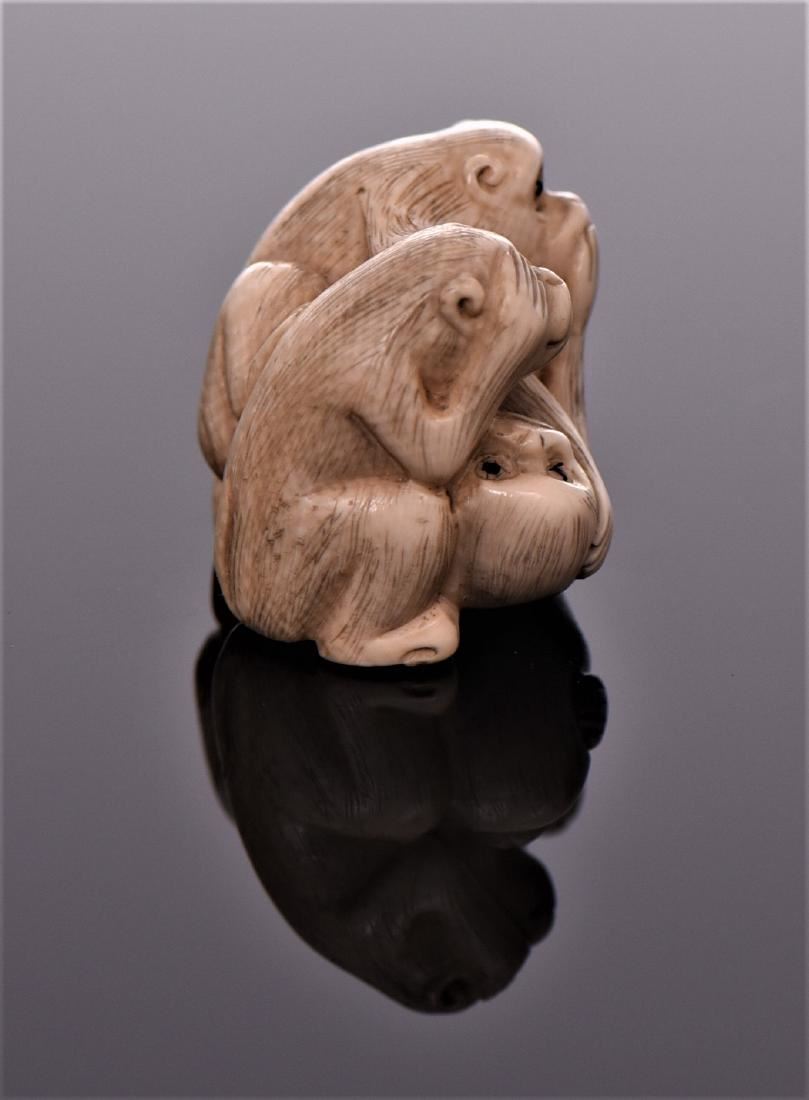Antique Pre-Ban Japanese Netsuke Depicting Three Monkeys, See No Evil, Speak No Evil, Hear No Evil. NOTE: Please be aware of US laws when bidding. This item cannot be shipped to certain US states and outside the United States. As a condition of the sale, all buyers agree to comply with all Federal regulations on ivory and the rules of the U.S. Fish & Wildlife Service â??CITESâ? as it relates to transport. It is the purchaserâ??s sole responsibility to obtain any and all licenses and/or certificates, as well as any other requirements. Estimated more than 100 yrs old. Japanese art covers a wide range of art styles and media, including ancient pottery, sculpture, ink painting and calligraphy on silk and paper, ukiyo-e paintings and woodblock prints, kiri-e, kirigami, origami, along with a myriad of other types of works of art. The earliest complex art in Japan was produced in the 7th and 8th centuries in connection with Buddhism. In the 9th century, as the Japanese began to turn away from China and develop indigenous forms of expression, the secular arts became increasingly important; until the late 15th century, both religious and secular arts flourished. Painting is the preferred artistic expression in Japan. Until modern times, the Japanese wrote with a brush rather than a pen, and their familiarity with brush techniques has made them particularly sensitive to the values and aesthetics of painting. With the rise of popular culture in the Edo period, a style of woodblock prints became a major form and its techniques were fine tuned to produce colorful prints. The Japanese, in this period, found sculpture a much less sympathetic medium for artistic expression. Japanese ceramics are among the finest in the world and include the earliest known artifacts of their culture. In architecture, Japanese preferences for natural materials and an interaction of interior and exterior space are clearly expressed. (Wikipedia) Size and/or Weight: See Measurement Photo. (Photos Represent The Lot Condition.)