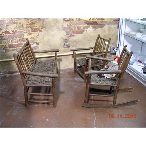 Adorable yet Primitive Child's Hickory Furniture Set. Circa 1905. VERY RARE matching set in this great condition. Includes bench (22.5h/32.5w/16d), chair (21.5h/17.5w/17d), and rocker (24h/19w/23d). Located in our premiere antique shop in Lincoln, NE.