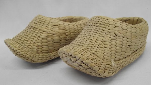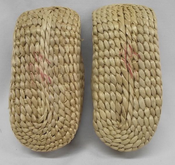 Antique Primitive Chinese Woven Straw Grass Shoes. This is a unique piece of Asian memorabilia and a beautiful folk art example of fine hand made woven shoes. 3'' Highest part x 7''L. Great for wear or exhibit.
