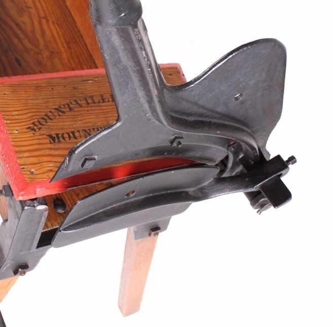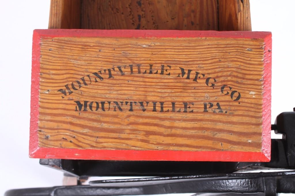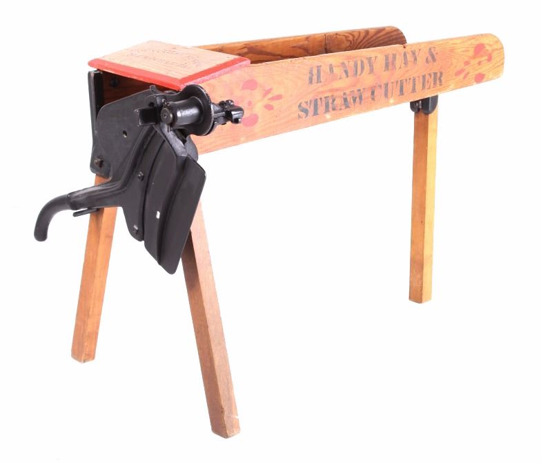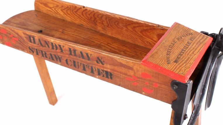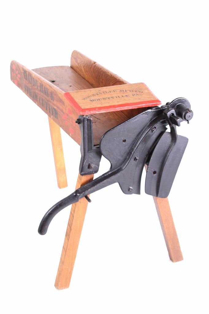 This lot features an antique primitive hay and straw cutter marked Mountville MFG. Co. Mountville PA. The chaff box or cutter was a simple but ingenious device for cutting straw chaff, hay, and oats into small pieces - before being mixed together with other forage and fed to horses and cattle. Apart from being more economical than previous methods of feeding, this aided the animal's digestion and prevented animals from rejecting any part of their food. the box is in good condition and all markings are clear. Great decor piece. Measures: 49" L x 29" H x 24" W