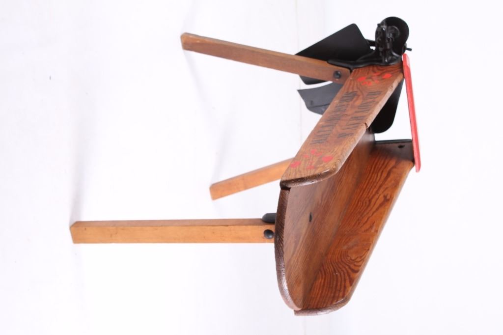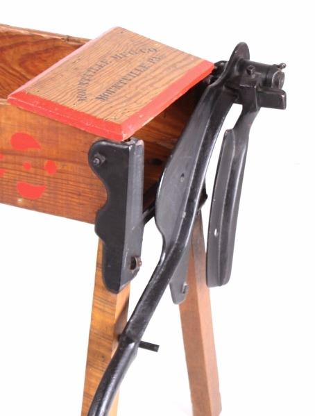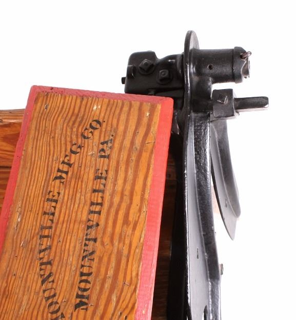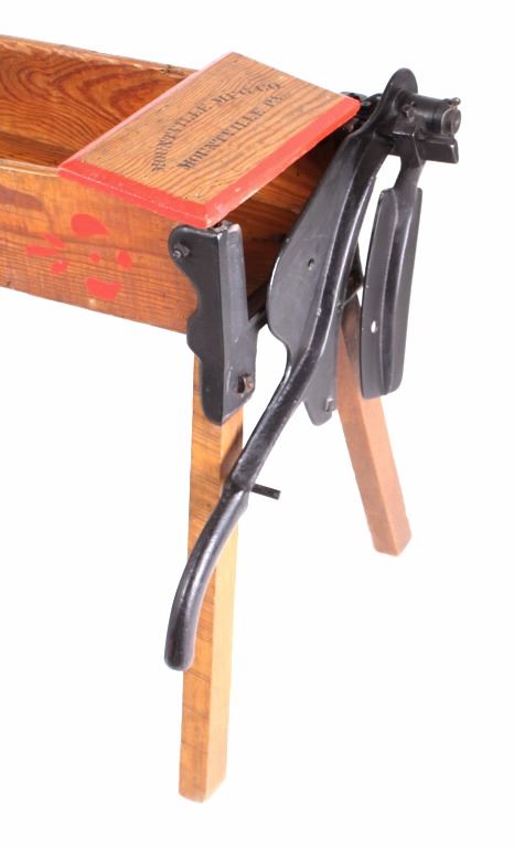 This lot features an antique primitive hay and straw cutter marked Mountville MFG. Co. Mountville PA. The chaff box or cutter was a simple but ingenious device for cutting straw chaff, hay, and oats into small pieces - before being mixed together with other forage and fed to horses and cattle. Apart from being more economical than previous methods of feeding, this aided the animal's digestion and prevented animals from rejecting any part of their food. the box is in good condition and all markings are clear. Great decor piece. Measures: 49" L x 29" H x 24" W