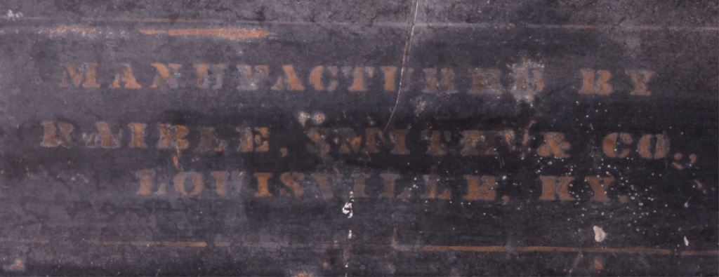 This is an antique primitive sifter. The sifter is marked "Raible, Smith & Co. Louisville Ky.". Material is put in the top of the hopper. The wooden lever moves back and forth to operate the sifting mechanism. A screen mesh allows the smaller material to fall through while keeping larger material in the hopper. A drawer is used to collect the sifted material. The entire sifter is made from pressed steel. It is in good condition. The sifter measures 17.75" in diameter and is 12.5" tall.