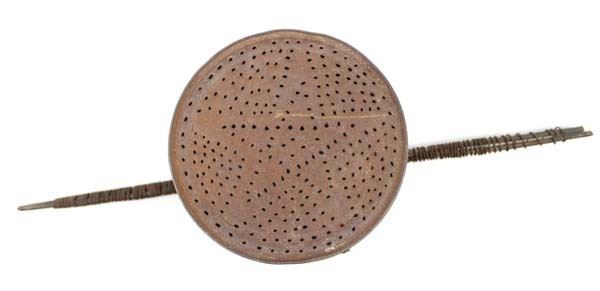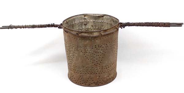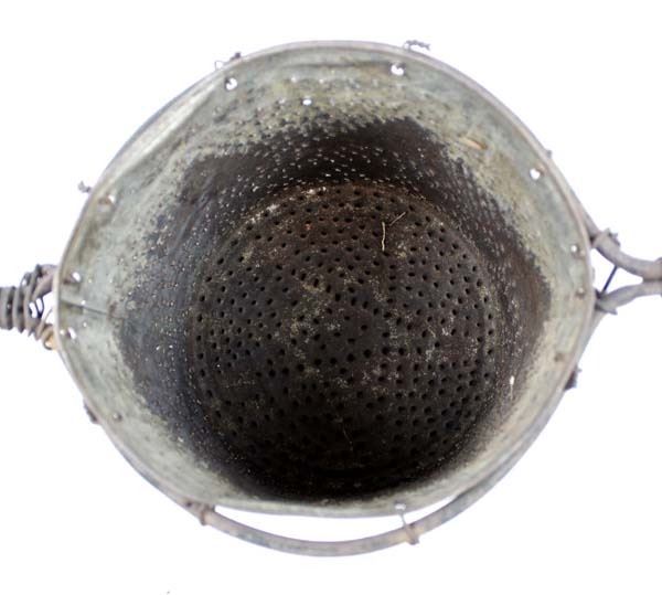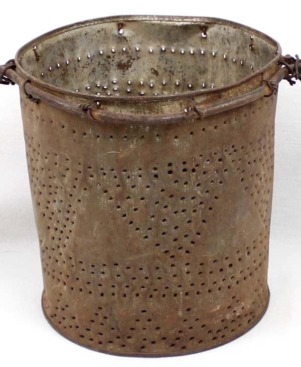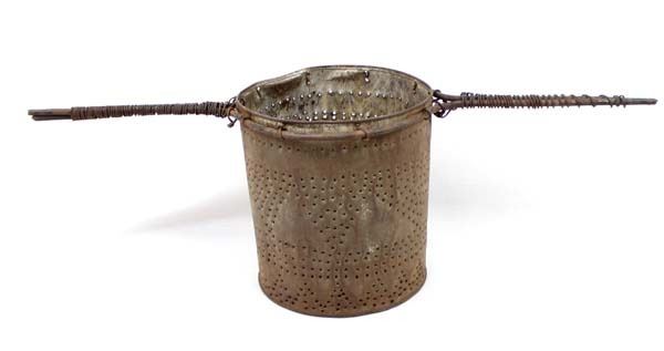 Antique Primitive Tin Can Strainer, measures 6'' x 7'' and has two 7.5''L handles for a total length of 21.5''L end to end