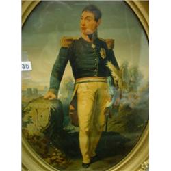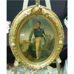 Antique Print of Gen Lafayette in Ornate Oval Wood frame. He is shown in full dress uniform of a French general with his hand resting on a rock with a plumed hat under left arm. In the background is the capital dome. Frame has been repainted. VG condition