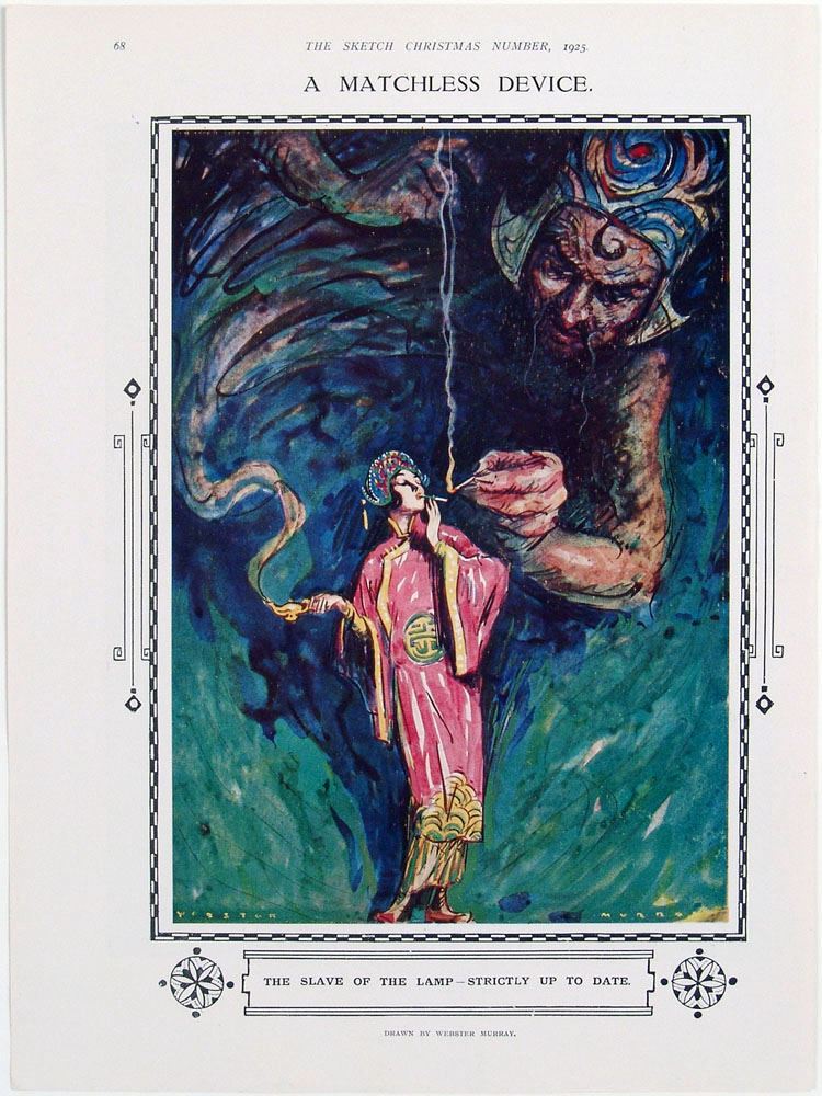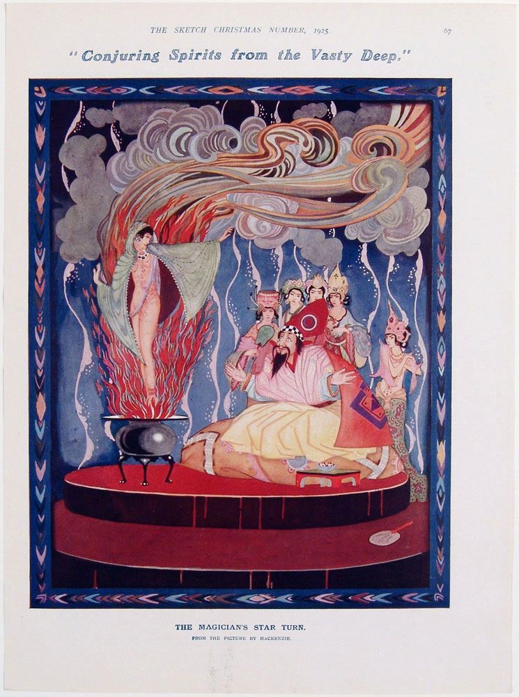 This is a pair of antique prints from The Sketch Christmas Number, 1925. Two prints back-to-back on one page. On one side is A Matchless Device: The Slave of the Lamp - Strictly Up to Date - artwork by Webster Murray. On the other side is The Magician's Star Turn: Conjuring Spirits from the Vasty Deep - artwork by Mackenzie. SIZE: Approx. 9 1/2" x 12 3/4".