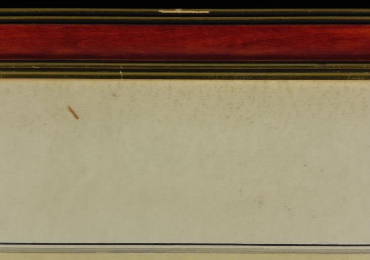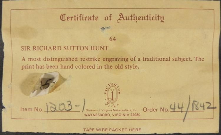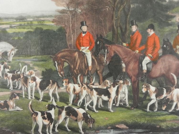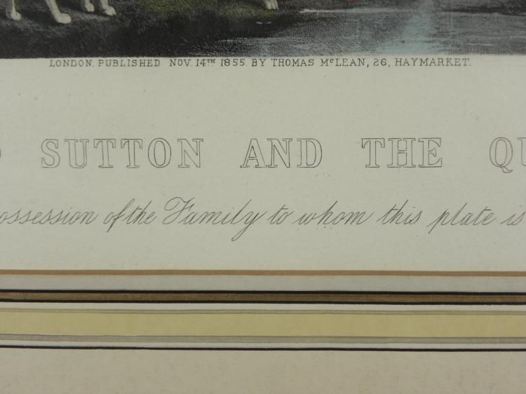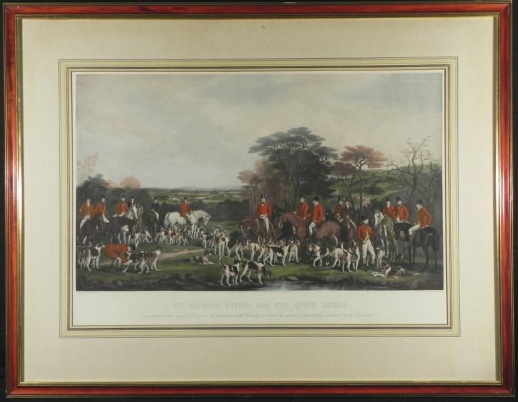 This antique print portrays one of the world's oldest fox hunting packs, getting ready for the hunt, known as the Quorn. Artist: Engraved by Frederick Bromley, after the painting by Francis Grant Title: Sir Richard Sutton and the Quorn Hounds Subtitle: "Engraved from the original picture in the possession of the family to whom the plate isrespectfully dedicated by the Publishers" Medium: Mixed method engraving on wove paper, Publisher: Thomas McLean, London Year: 1855 Image size: 21 x 31 inches Framing: Matted in off-white with decorative striping, in cherry/brown wood frame with gold painted sides and trim Frame size: 30 x 39 inches Condition: Excellent; some scuffs on the frame Certificate of Authenticity: Included, affixed to reverse side