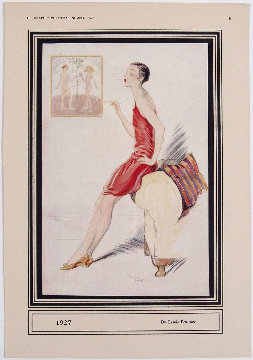 This is an antique print from The Graphic Christmas Number, 1927. Artwork by Lewis Baumer. The artwork is a separate print attached to the page along just the left side of the print. SIZE: Overall: Approx. 9 3/4" x 14". Print: 6 1/2" x 10".
