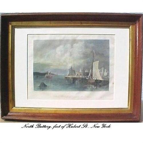 Antique Color Print of the New York Battery Military Fort. This antique hand-colored print is entitled North Battery, Foot of Hubert St, New York. This military fort was created by 2 famous American artists, Robert W. Weir and James Smillie. This historic round military garrison, important during the Revolution and War of 1812 but no longer standing, is the original site in New York harbor of the present Fort Hamilton whose flag was raised in 1831. Print text reads: Painted and Engraved for the New York Mirror, 1833. Printed by J. Neale. Painted scene is 8.75 in.W x 6H plus text. Print is in antique deep walnut frame with gold leaf lip, 12.5 in.H x 16.5W. Handsome addition for history buffs.