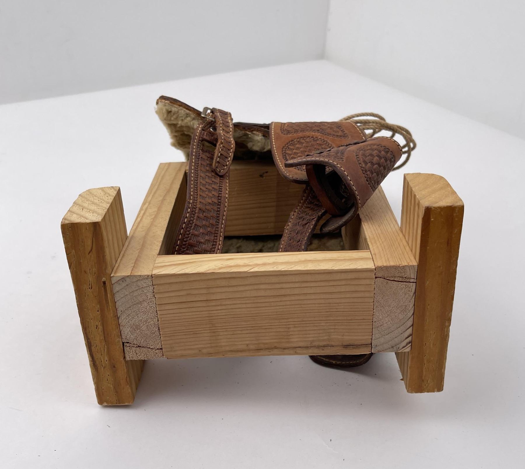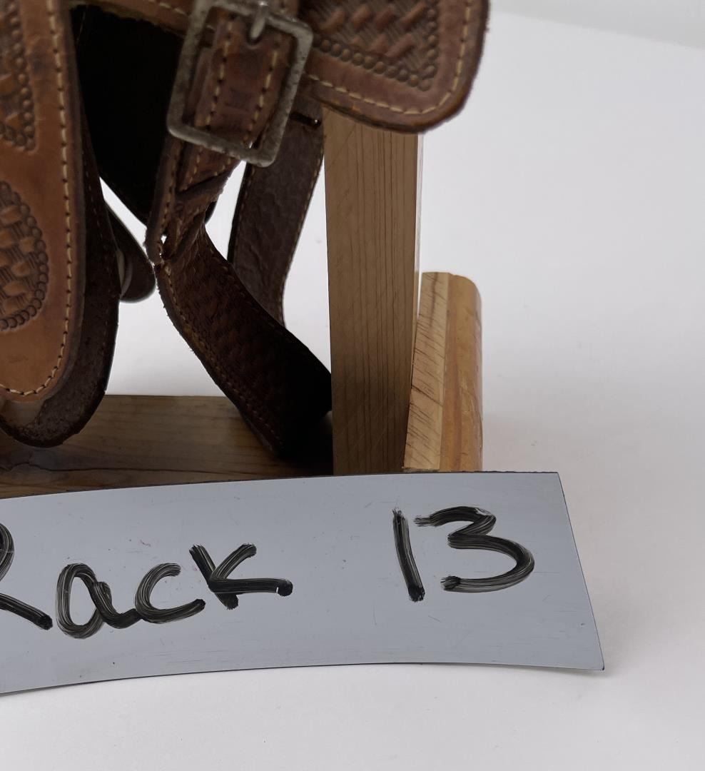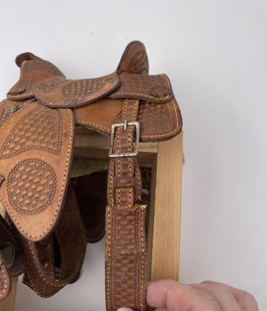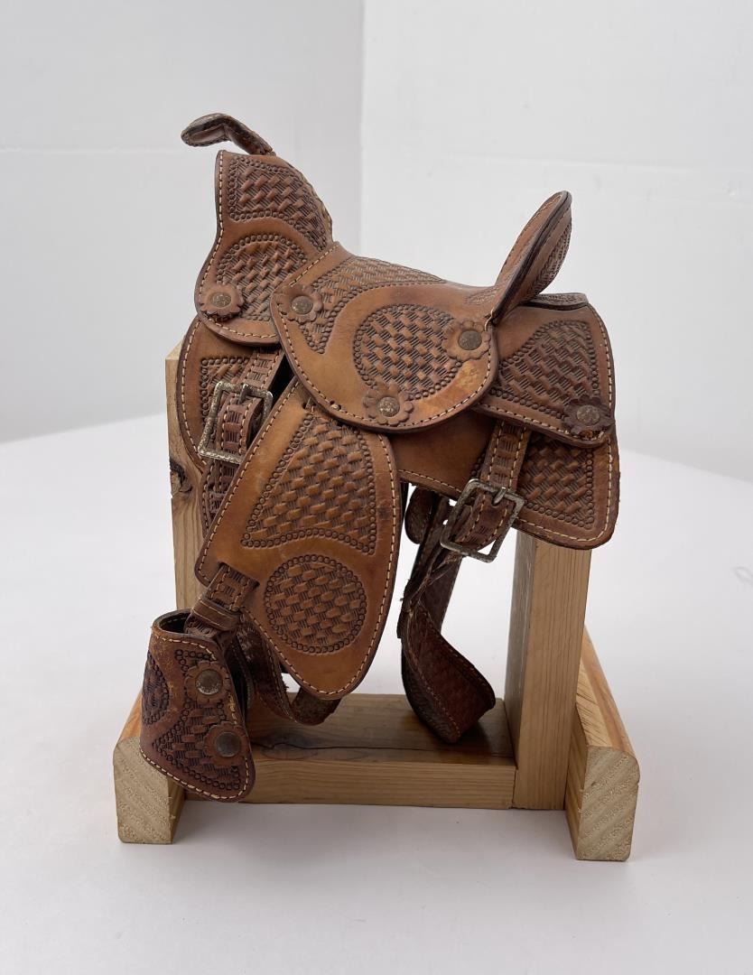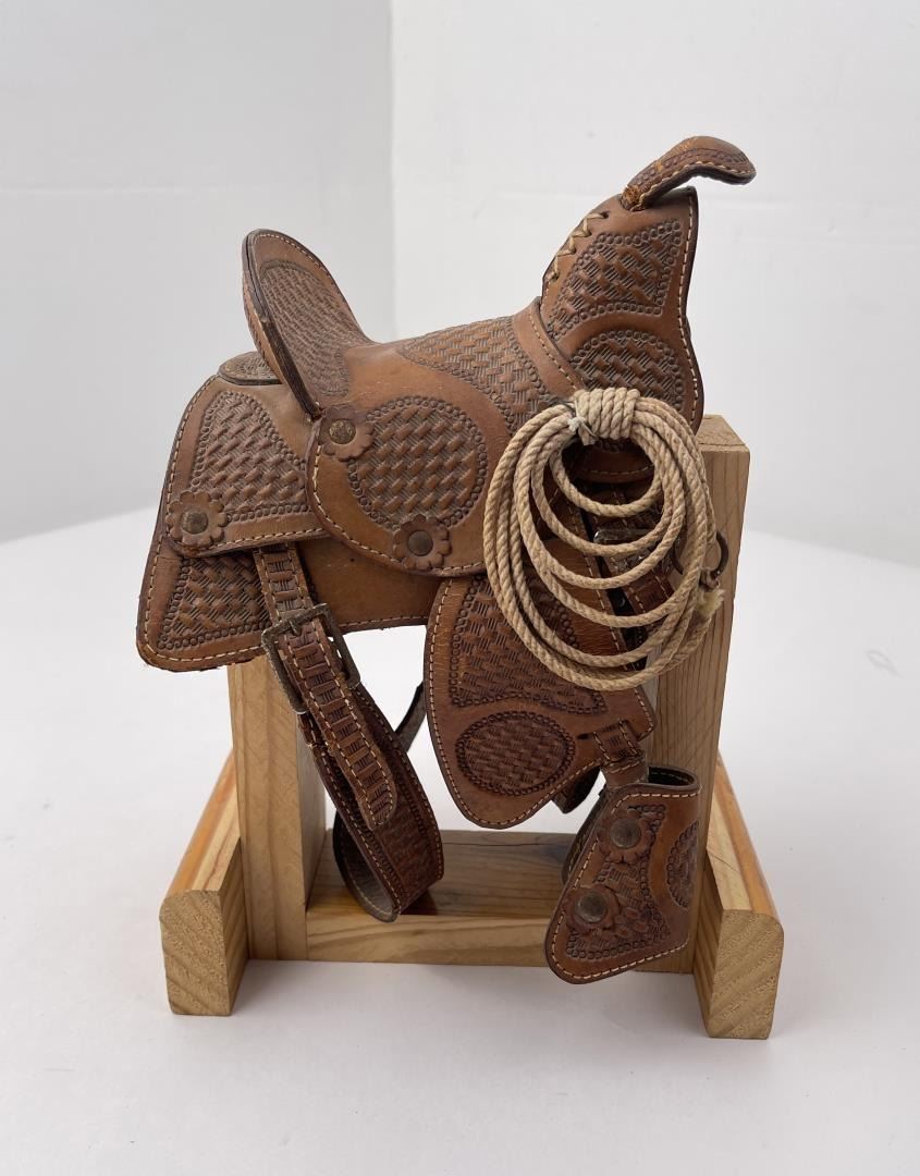 Nice salesman sample saddle with stand. 10 1/4" long, 7 3/4" tall.