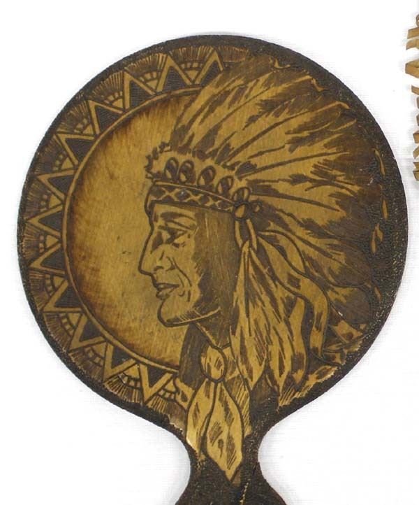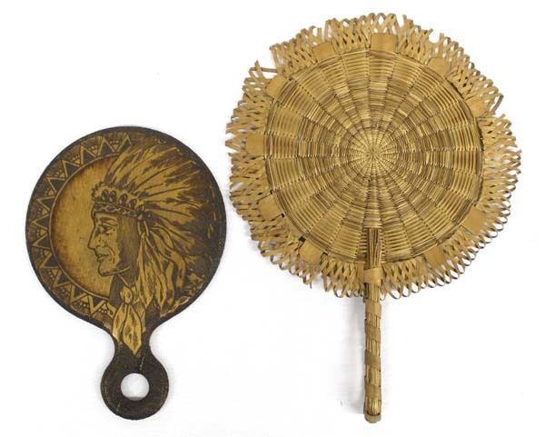 Antique Pyrography Indian Chief Wood Hand Mirror & Native American Penobscot Basketry Fan, hand mirror is missing glass and bottom of handle has been glued, largest is the fan measuring 10.5''D x 14.5'' with handle