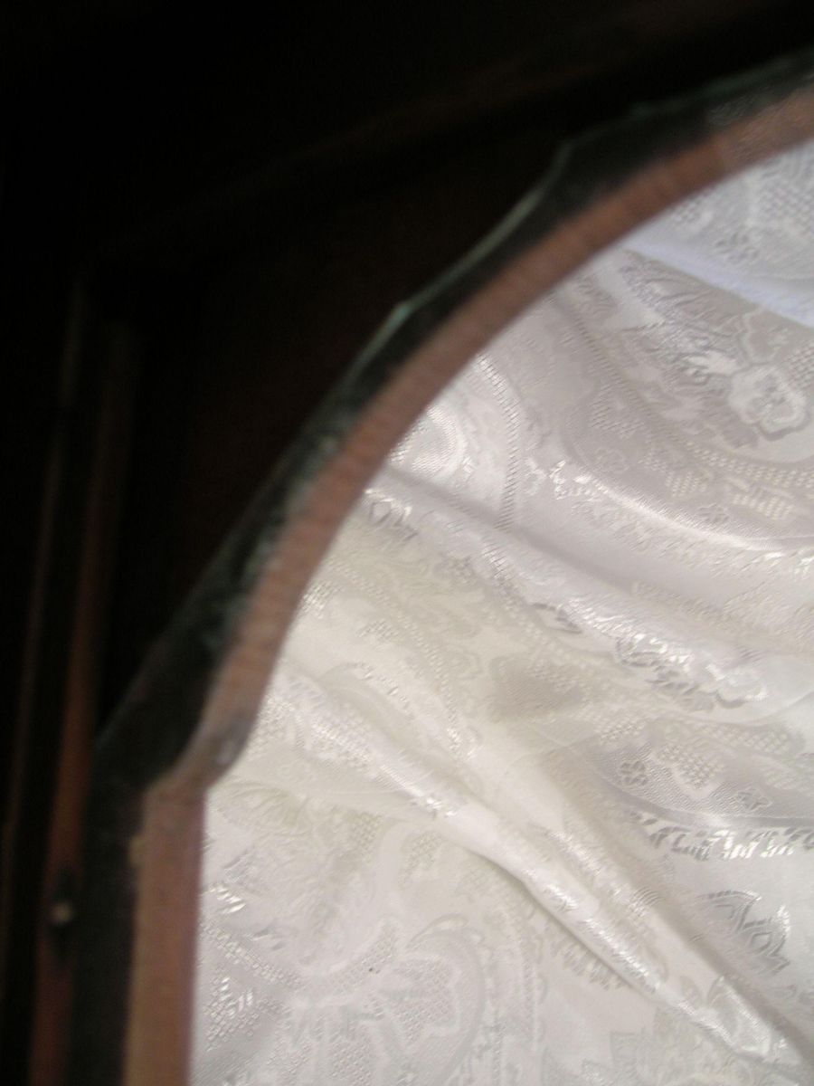 Antique wall clock with key winding movement, chime, and 3 glass panes. Roman numeral clock face, pendulum is marked "R A". Unknown manufacturer - there is a mark on the back of the movement that looks like a "B" but I cannot make it out without dissassembling the clock. Lot includes key for winding the clock. There is damage to the glass pane on the right side (facing the clock) - the piece of glass that is missing is covered from the outside by the wood frame, and the piece of glass is included in the lot.