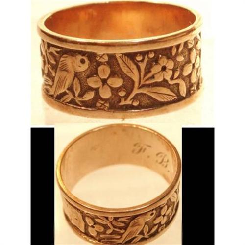 Antique figural rings are far and few between and this one really has more detail than most I have seen. The raised relief pair of victorian birds protect the center plaque where initials would have gone. The flowers and the birds represent symbols used in memorials so I would guess this is a ring given to someone after the passing of their loved one. This is wide ( almost 1/2") and has that rich rose gold that you can hardly find anymore. This is a size 7 1/2 and has the initials FB in cursive on the inside. It is in beautiful condition with the only marks being two lines on the inside. Don't miss out on this fabulous antique heirloom.