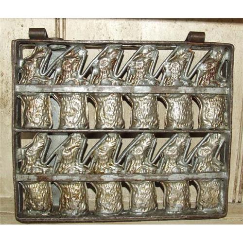 This is a wonderful piece that is very old and very heavy. It measures 11.5? x 9.5?. It has 12 rabbit molds each measuring 4? x 1.6?. The piece is in very nice condition for its age.