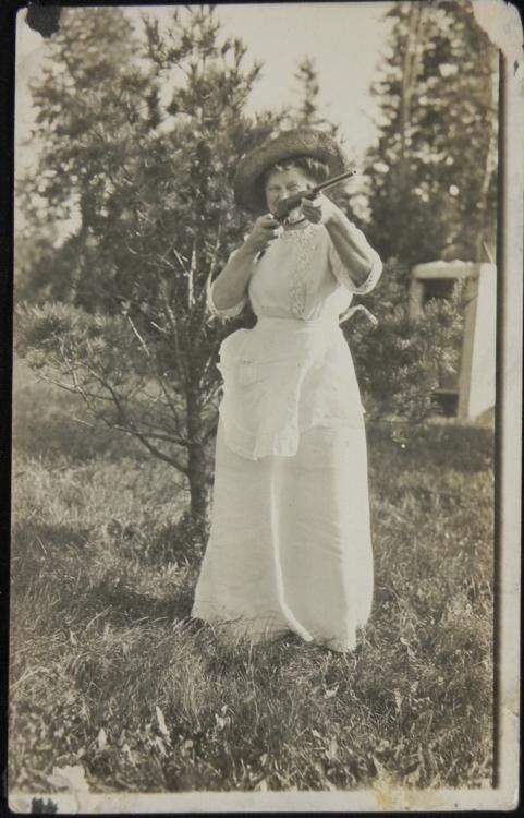 Here is a Real Photo Postcard of a lady holding and pointing a single barrel rifle. She is standing outside, possibly in a yard, but she is dressed in fine white summer dress, offset by a straw hat. The quality of the image is excellent and crisp. The condition of the postcard is very good, with some surface wear at the corners, and on back. * * This is a