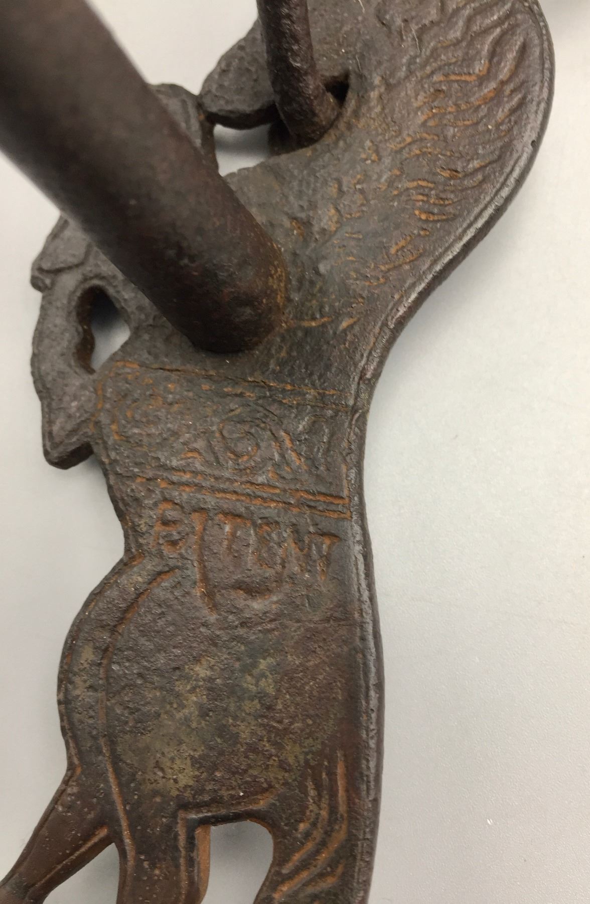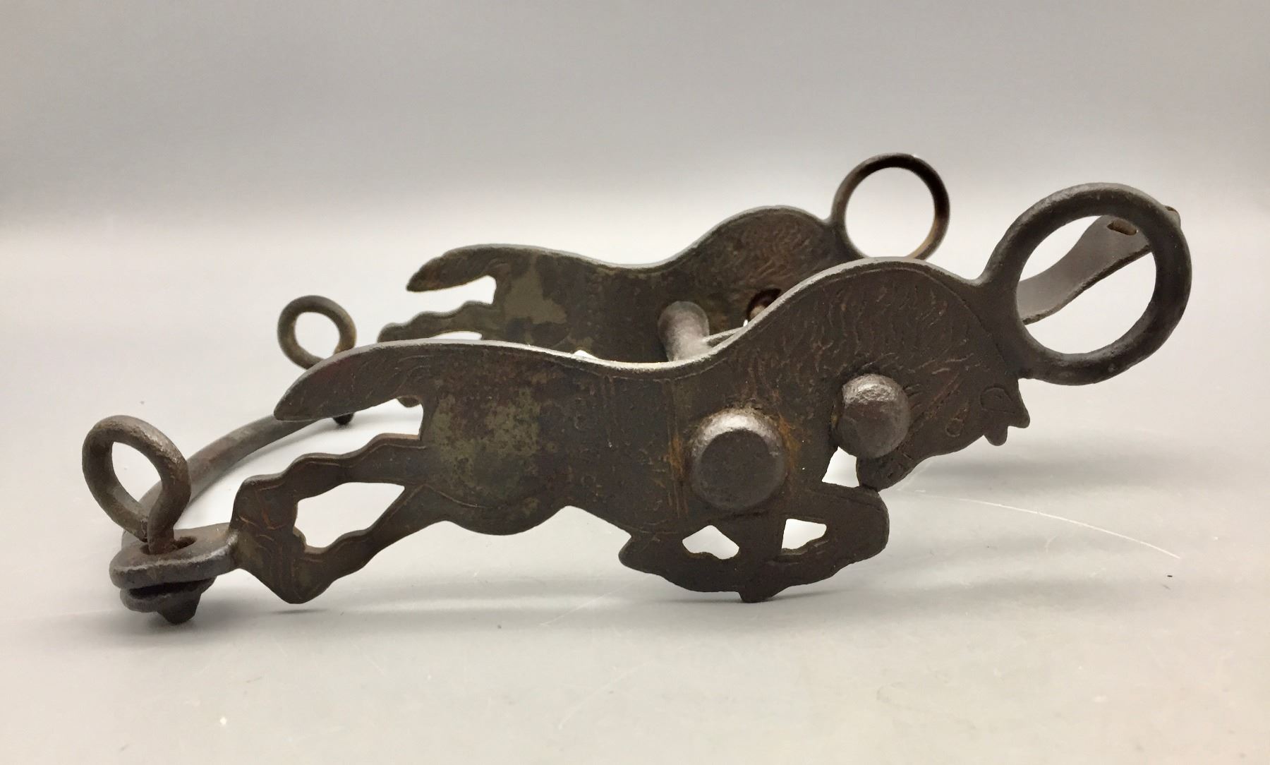 Description: Presented for sale in this lot is an an antique rearing horse spade bit with a nice patina. Maker: Could be an old Buermann, he offered these for sale, or perhaps this is one of the predecessors. Approx. Age: Dated Feb. 10, 1885 on the cheek (Pat. Date). Size: 4-1/2” wide, 7” shank. Condition: Fair for its age, normal wear expected. Please look closely at the pictures - they are an important part of our description. Shipping: There will be a $5 handling / packaging fee for shipping this lot. The actual cost of postage will be added on top of that.