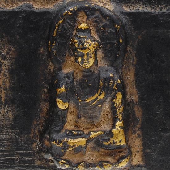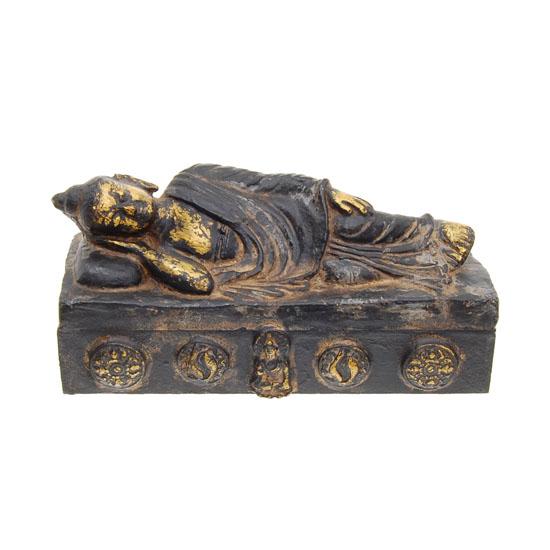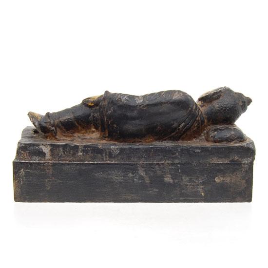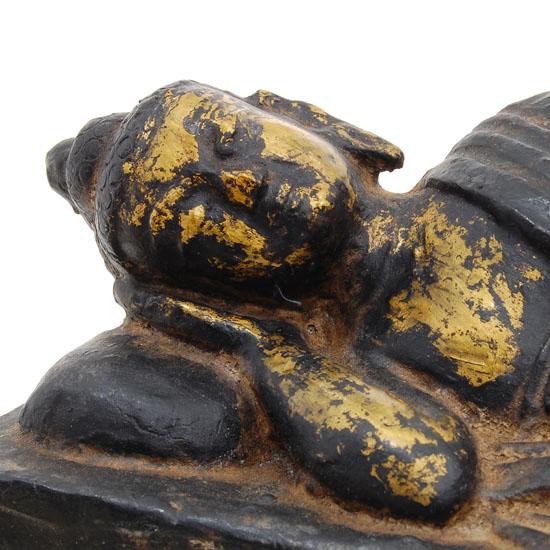 Excellent Tibet antique early teak carved 1900s Buddha piece in reclining death pose on box base with some gilding remaining, 12"