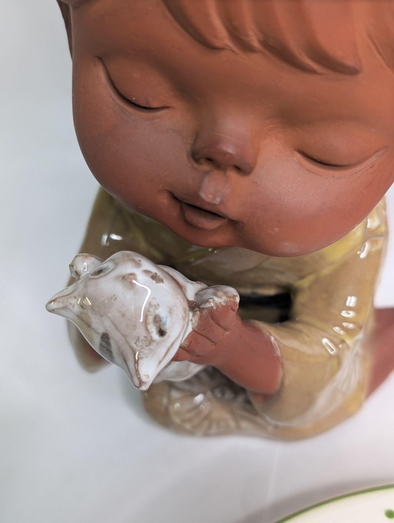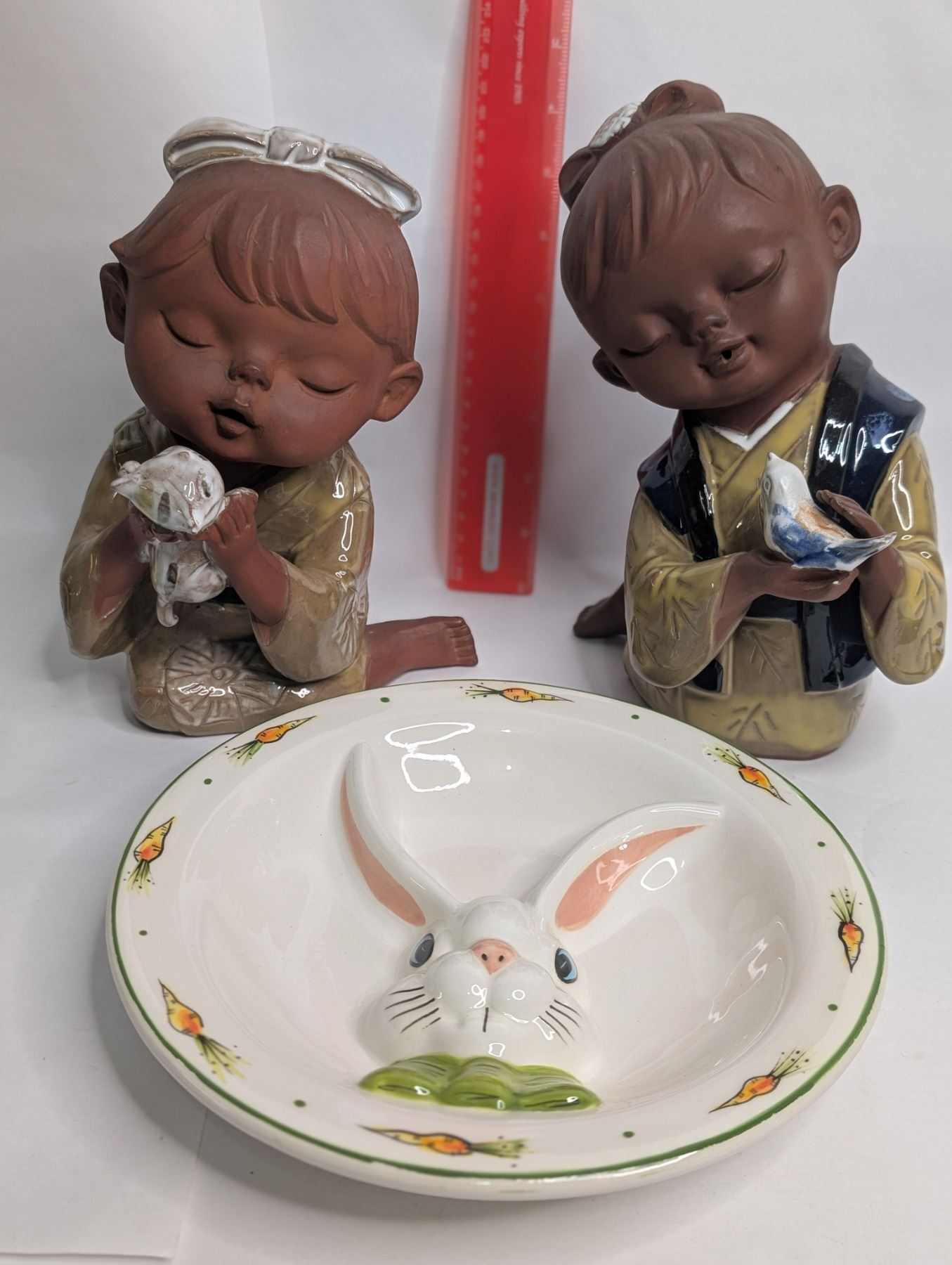 Antique Red Clay Figurines and Eva Gozton Bunny Plate