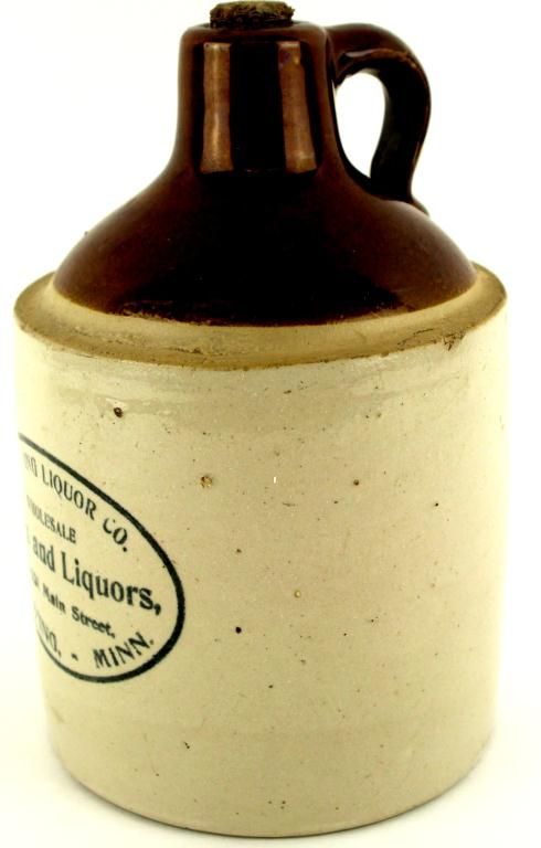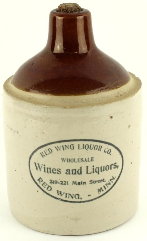 Antique Red Wing Advertising crock jug, the front stamped Red Wing Liquor Co. Wholesale Wines and Liquors Red Wing Minn. 9" tall showing very good condition. Est. 450-650