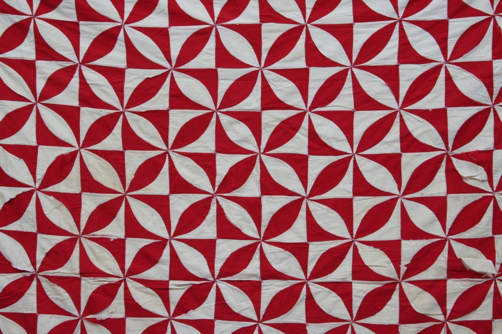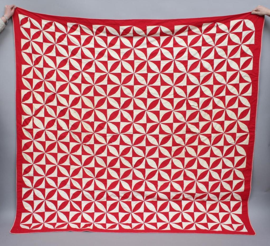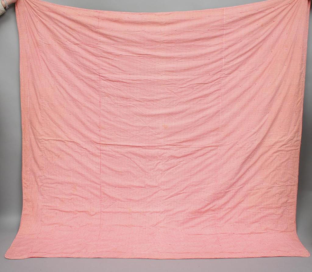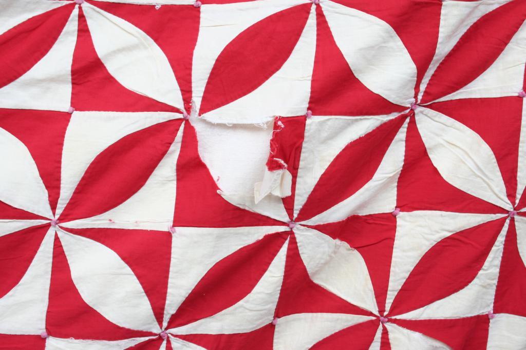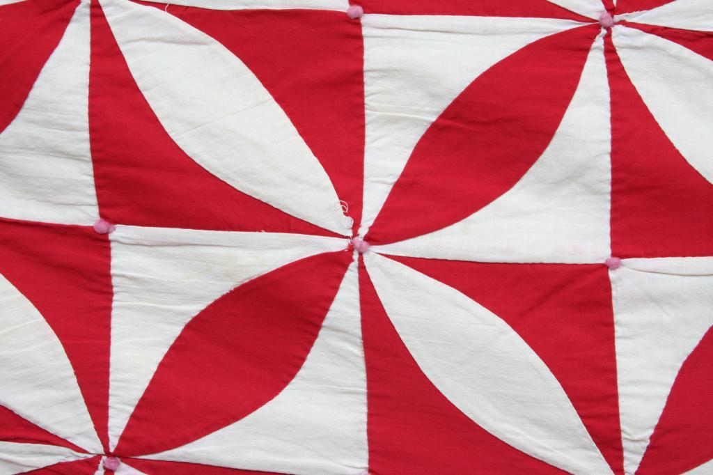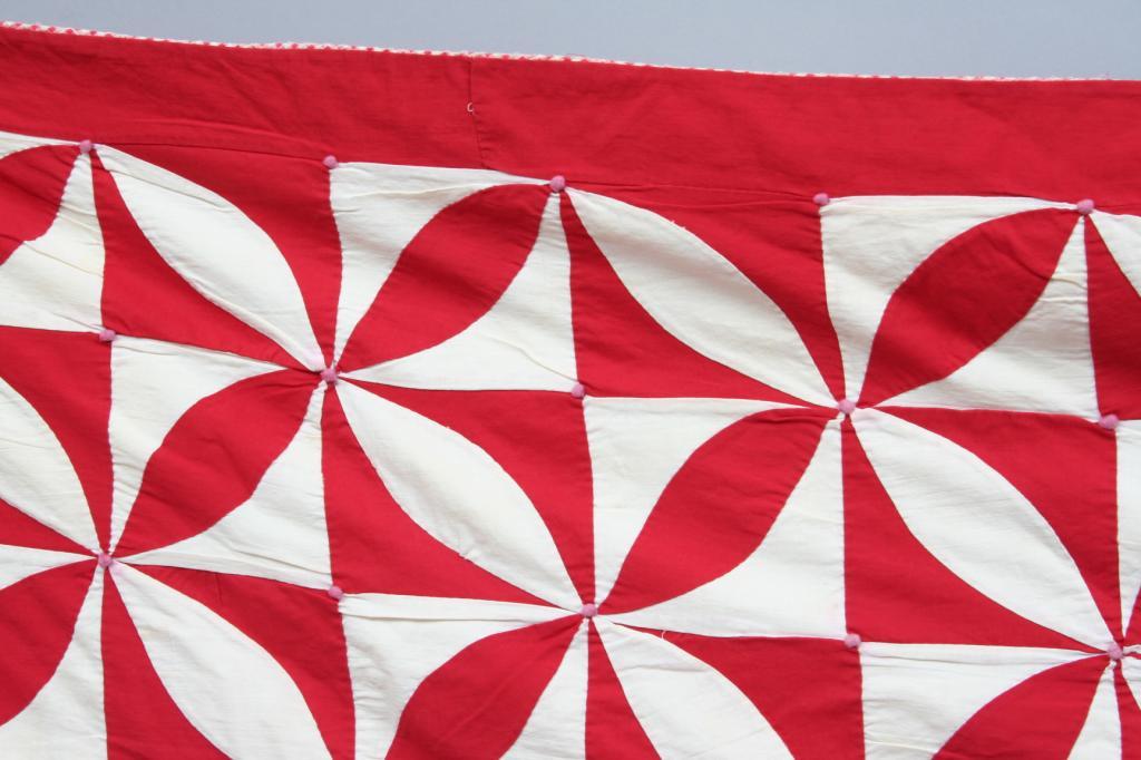 Constructed in red and white cotton in a medallion motif, the colors gathered together in the center forming a raised ball in the center of each medallion, backed in red and white checkered fabric. 6'9" x 6'10". Condition: 10" section where fabric is fraying, generally good.