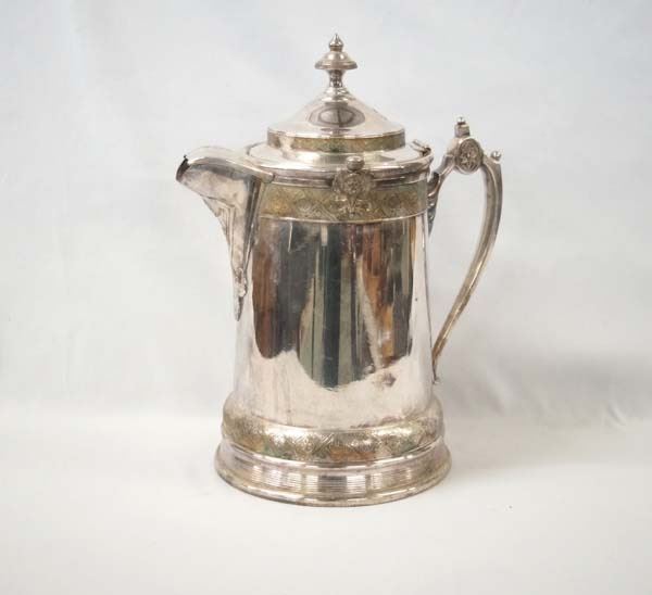 Reed and Barton Victoriana Cold Beverage Silver Pitcher, measures 14'' x 11.5'', ''Magnificent Antique Victorian cold beverage silverplated pitcher. This fantastic pitcher features highly decorated hand-engraved and hand-chased floral accents all over, from the centerpiece, to the spout, to the handle and finial. It was made by Reed & Barton and stamped Patented Aug 4, 1868 to May 1879. Also incribed 1860 on the base.''