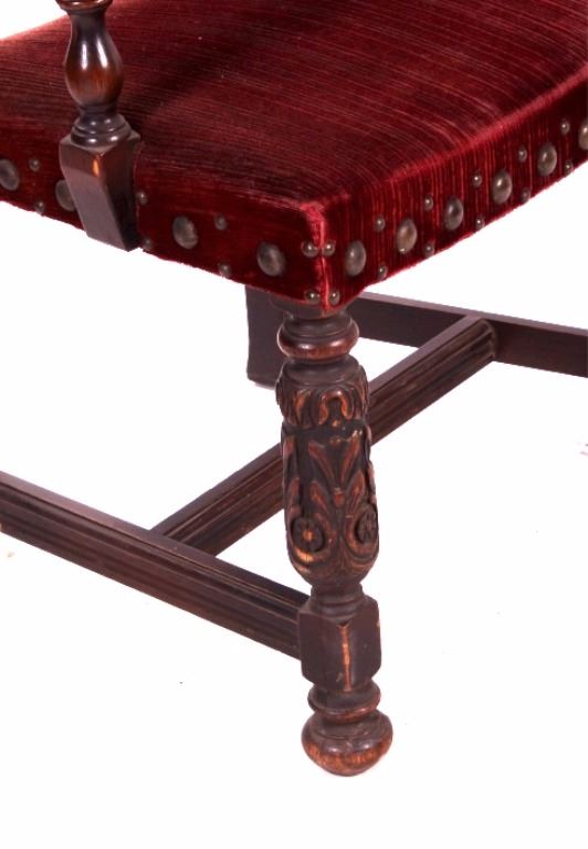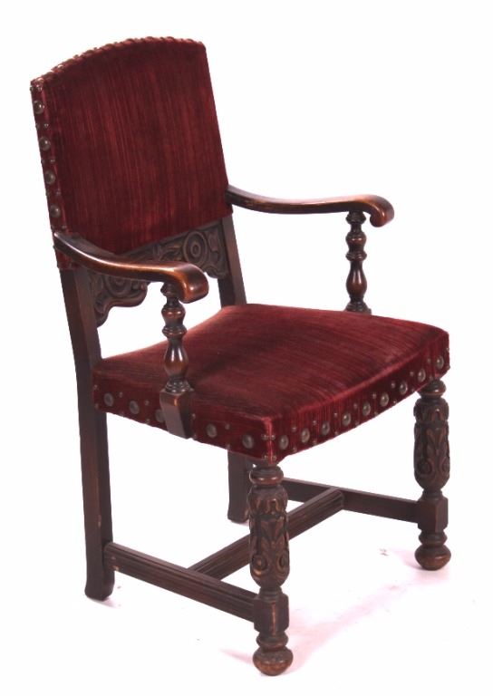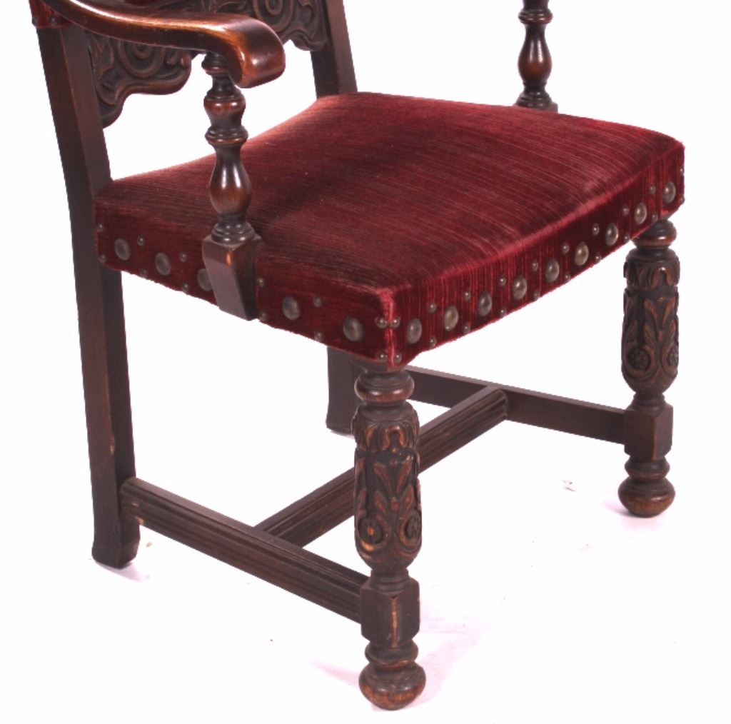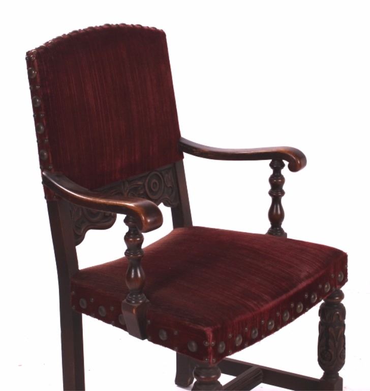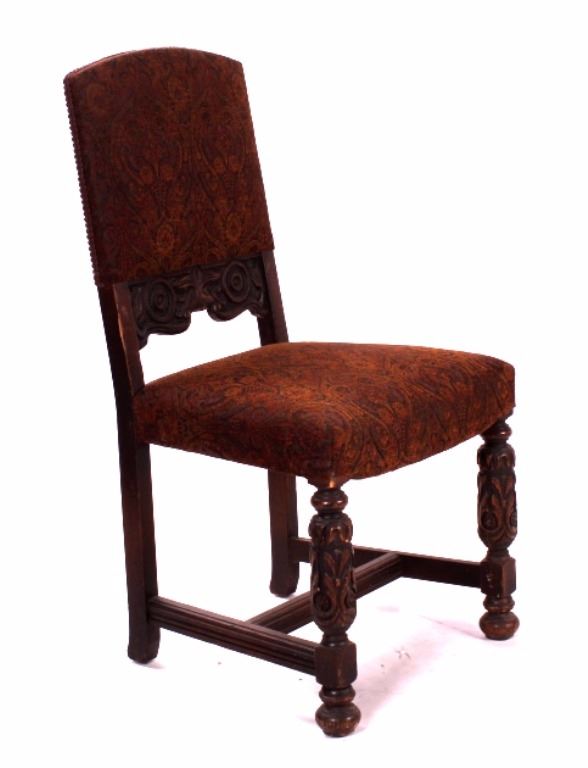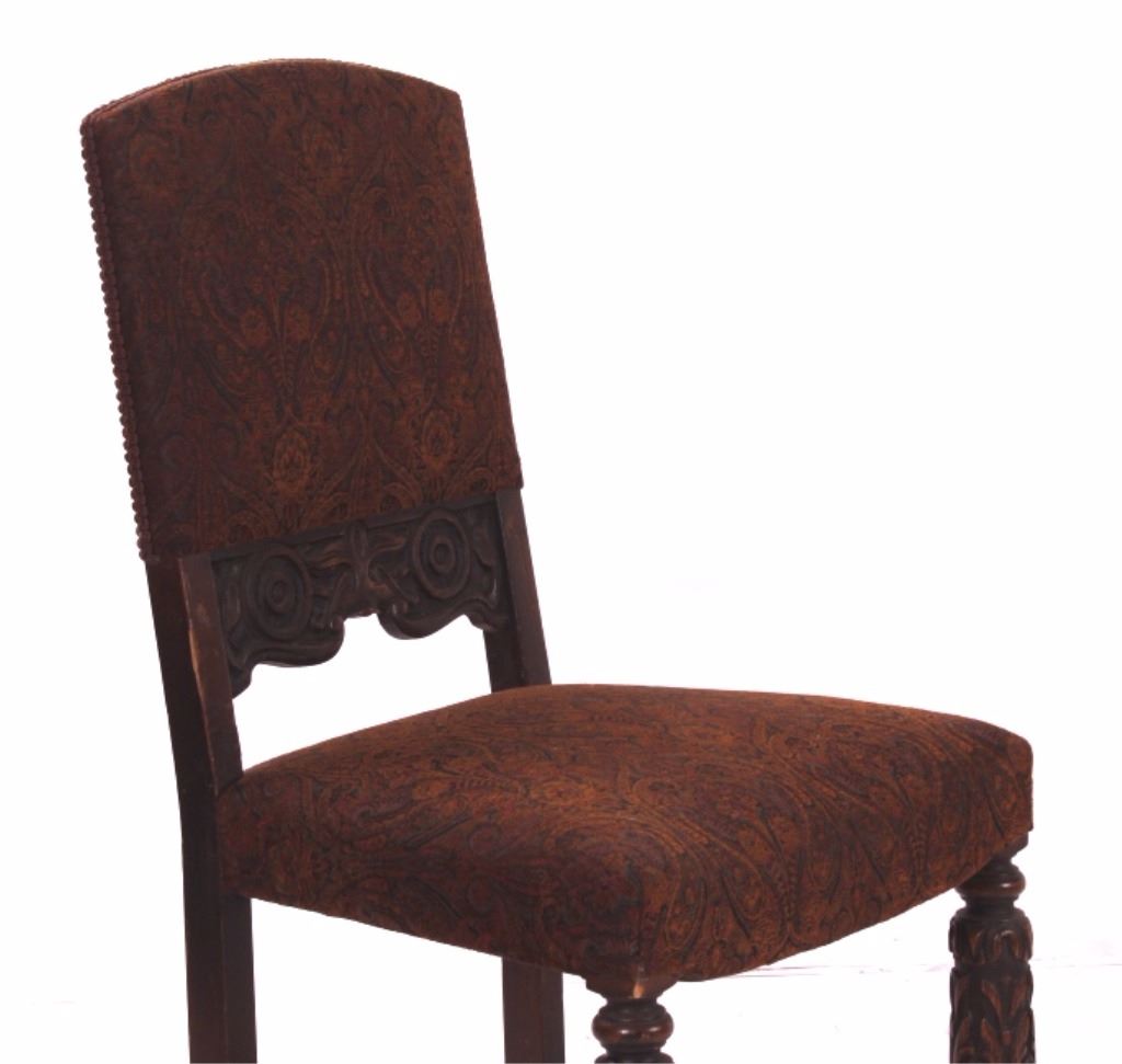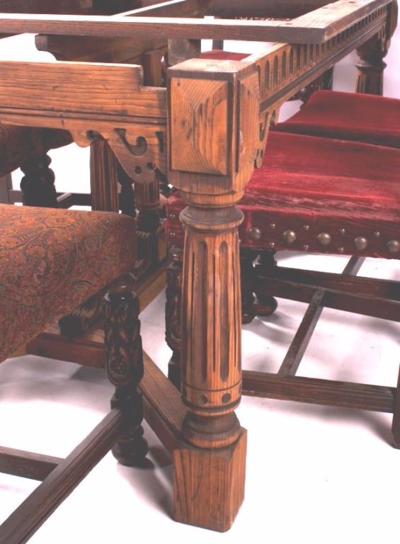 This is an antique refrectory table and chairs. The table has two hidden leaves that slide out from under the top to extend the length of the table. Included with the table are six dining room chairs. This is a matching set of chairs, however, three of the chairs are upholstered differently. The refectory table and chairs are in good condition.